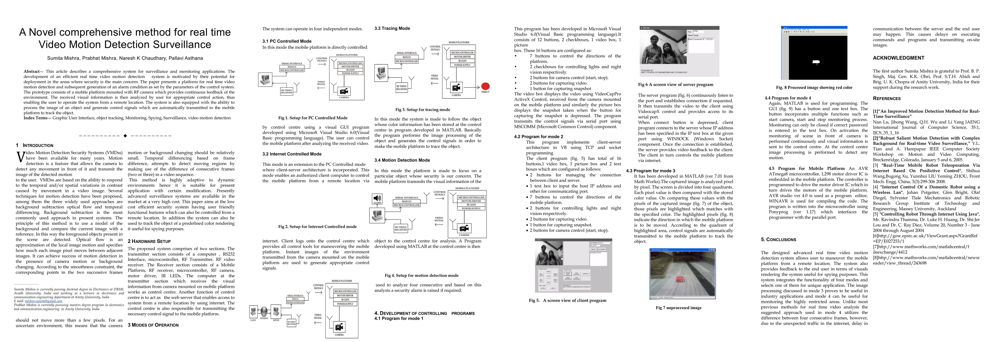 This paper introduces a novel real-time video motion detection system for surveillance, featuring a mobile RF camera platform that continuously monitors environments and generates alarms based on set parameters. The system allows remote operation and automatic tracking of detected objects.