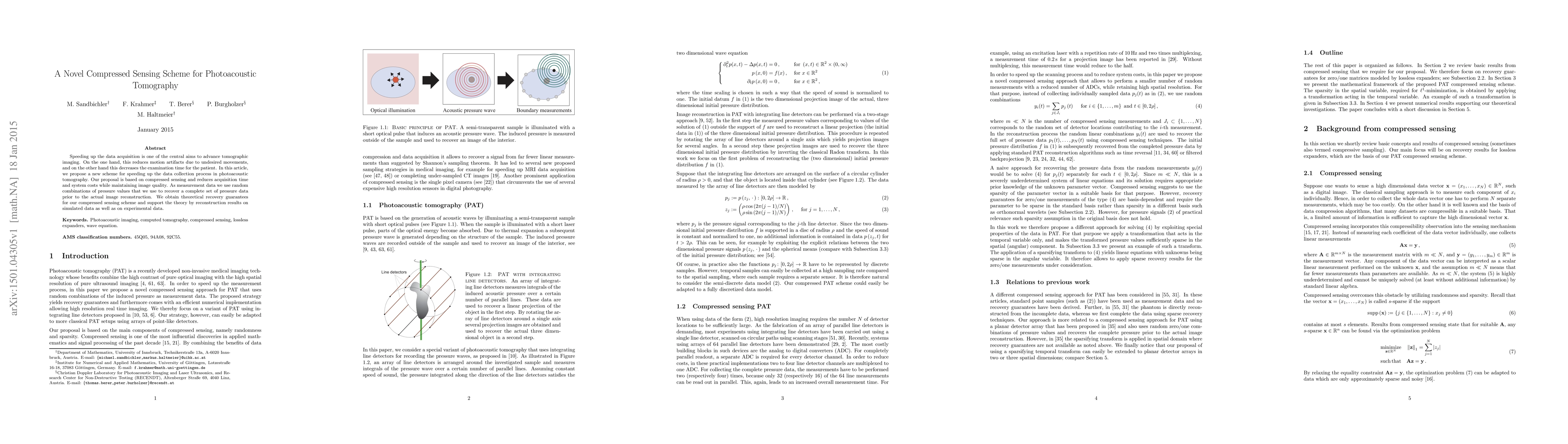 This paper proposes a compressed sensing scheme to accelerate data acquisition in photoacoustic tomography, reducing motion artifacts and patient examination time. The scheme uses random pressure value combinations to reconstruct complete data, ensuring image quality while cutting acquisition time and system costs, supported by theoretical guarantees and reconstruction results on both simulated and experimental data.