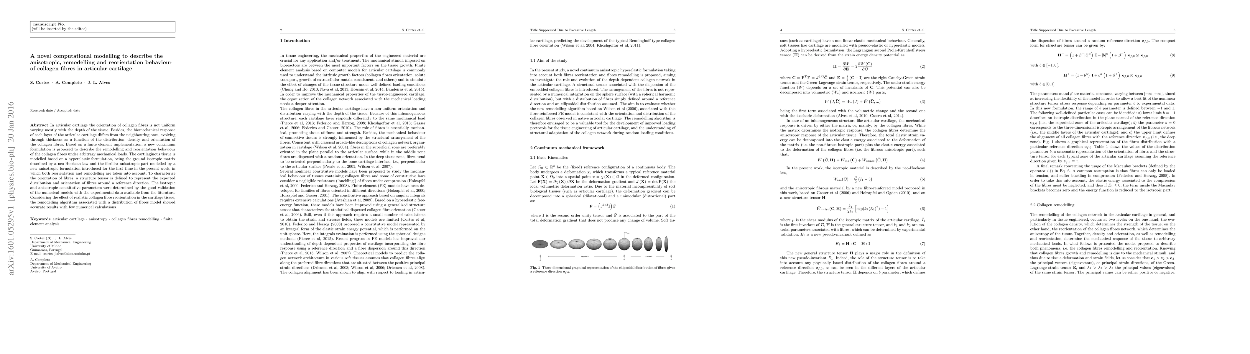 This paper proposes a novel computational model to describe the anisotropic remodelling and reorientation of collagen fibres in articular cartilage using a finite element approach. The new model incorporates a hyperelastic formulation with an anisotropic component, validated by experimental data, to accurately simulate the biomechanical response of cartilage layers.