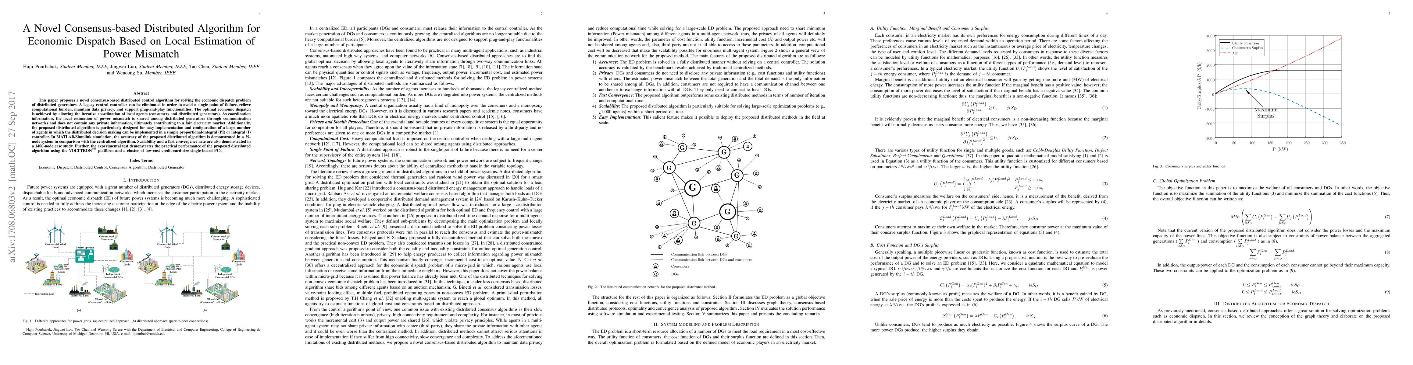 This paper introduces a consensus-based distributed algorithm for economic dispatch among distributed generators, eliminating the need for a central controller. The algorithm achieves optimal dispatch through local estimation and sharing of power mismatch information, ensuring scalability, fast convergence, and fair market conditions.