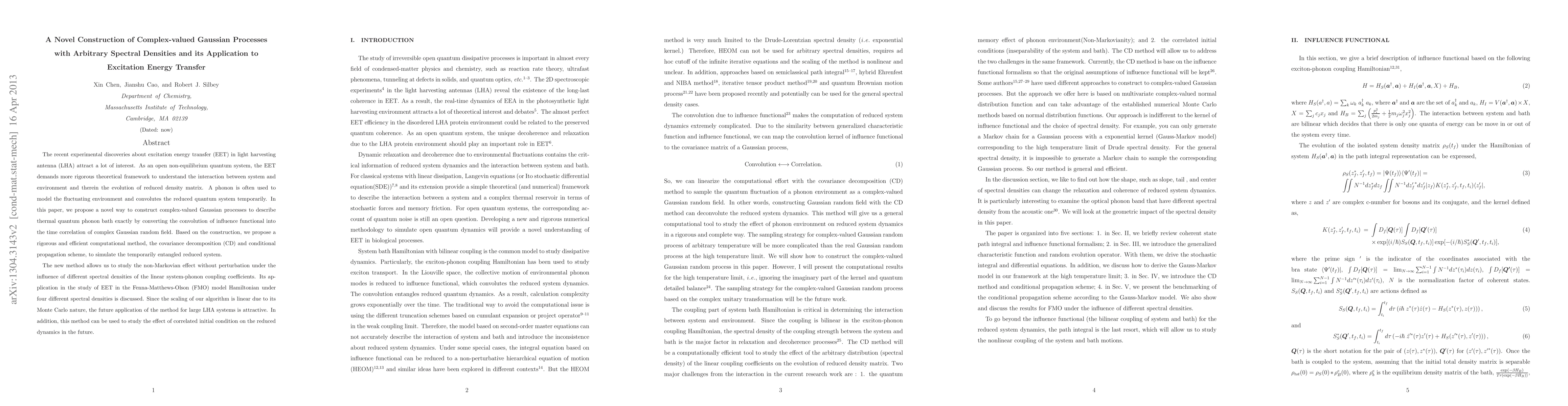 The recent experimental discoveries about excitation energy transfer (EET) in light harvesting antenna (LHA) attract a lot of interest. As an open non-equilibrium quantum system, the EET demands more rigorous theoretical framework to understand the interaction between system and environment and therein the evolution of reduced density matrix. A phonon is often used to model the fluctuating environment and convolutes the reduced quantum system temporarily. In this paper, we propose a novel way to construct complex-valued Gaussian processes to describe thermal quantum phonon bath exactly by converting the convolution of influence functional into the time correlation of complex Gaussian random field. Based on the construction, we propose a rigorous and efficient computational method, the covariance decomposition (CD) and conditional propagation scheme, to simulate the temporarily entangled reduced system. The new method allows us to study the non-Markovian effect without perturbation under the influence of different spectral densities of the linear system-phonon coupling coefficients. Its application in the study of EET in the Fenna-Matthews-Olson (FMO) model Hamiltonian under four different spectral densities is discussed. Since the scaling of our algorithm is linear due to its Monte Carlo nature, the future application of the method for large LHA systems is attractive. In addition, this method can be used to study the effect of correlated initial condition on the reduced dynamics in the future.