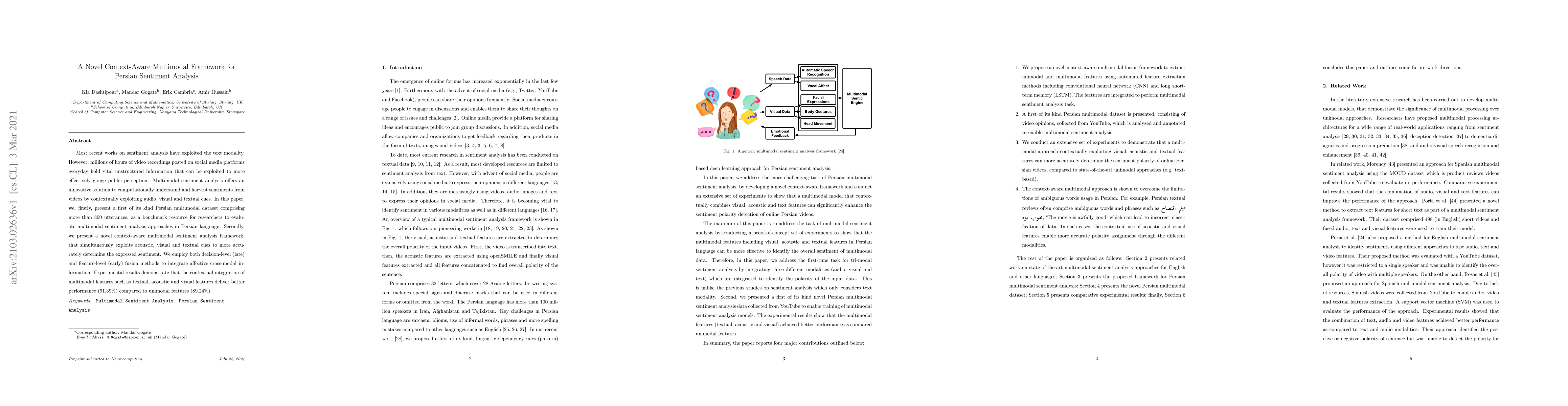 The paper introduces a novel context-aware multimodal sentiment analysis framework that combines audio, visual, and textual features for Persian language, along with a benchmark dataset for evaluating such approaches.