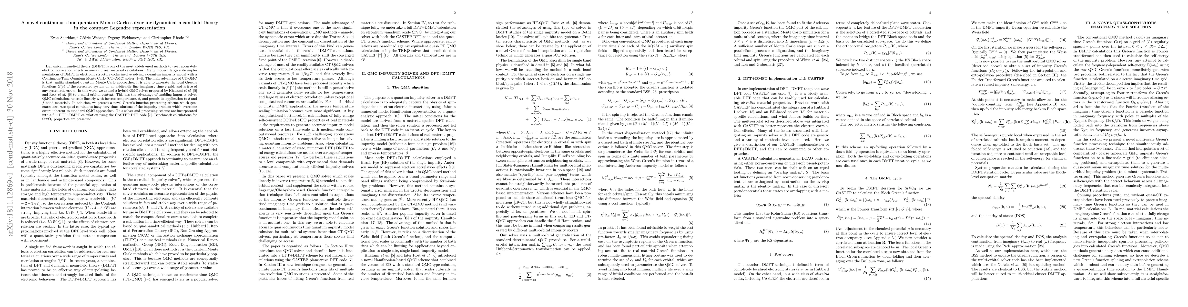 This paper introduces a novel continuous time quantum Monte Carlo solver for dynamical mean-field theory, extending it to multi-orbital contexts to scale linearly with inverse temperature. It also presents a new Green's function processing scheme to generate quasi-continuous imaginary time solutions, enhancing accuracy and applicability to d and f band materials.