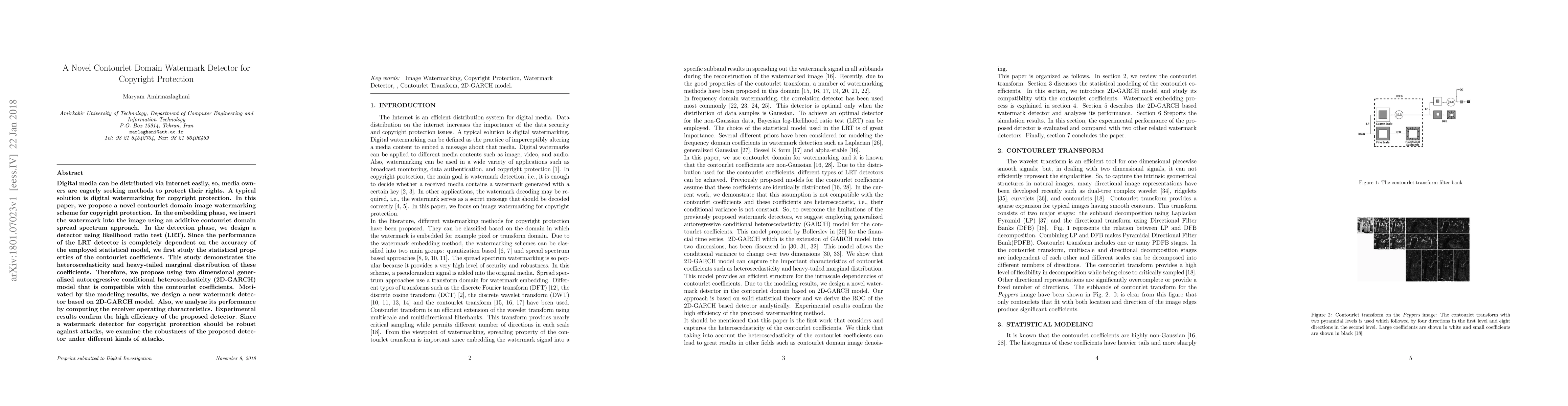 This paper proposes a novel contourlet domain watermark detector for copyright protection using a spread spectrum approach and a likelihood ratio test (LRT) based on a 2D-GARCH model to account for the statistical properties of contourlet coefficients. Experimental results show high efficiency and robustness against various attacks.