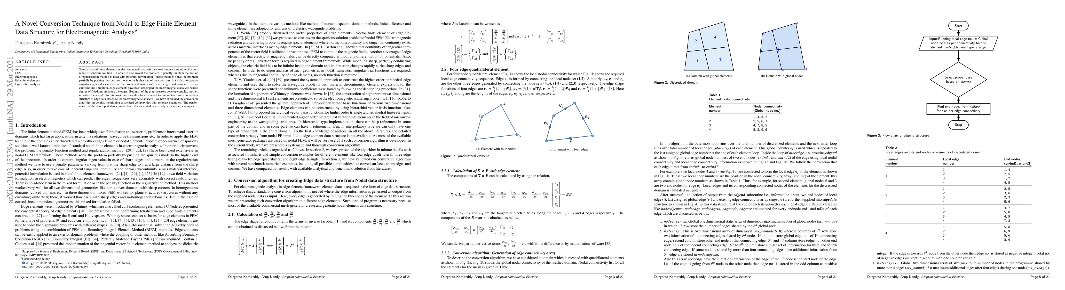 Standard nodal finite elements in electromagnetic analysis have well-known limitation of occurrence of spurious solution. In order to circumvent the problem, a penalty function method or a regularization method is used with potential formulation. These methods solve the problem partially by pushing the spurious mode to the higher end of the spectrum. But it fails to capture singular eigenvalues in case of the problem domains with sharp edges and corners. To circumvent this limitation, edge elements have been developed for electromagnetic analysis where degree of freedoms are along the edges. But most of the preprocessors develop complex meshes in nodal framework. In this work, we have developed a novel technique to convert nodal data structure to edge data structure for electromagnetic analysis. We have explained the conversion algorithm in details, mentioning associated complexities with relevant examples. The performance of the developed algorithm has been demonstrated extensively with several examples.