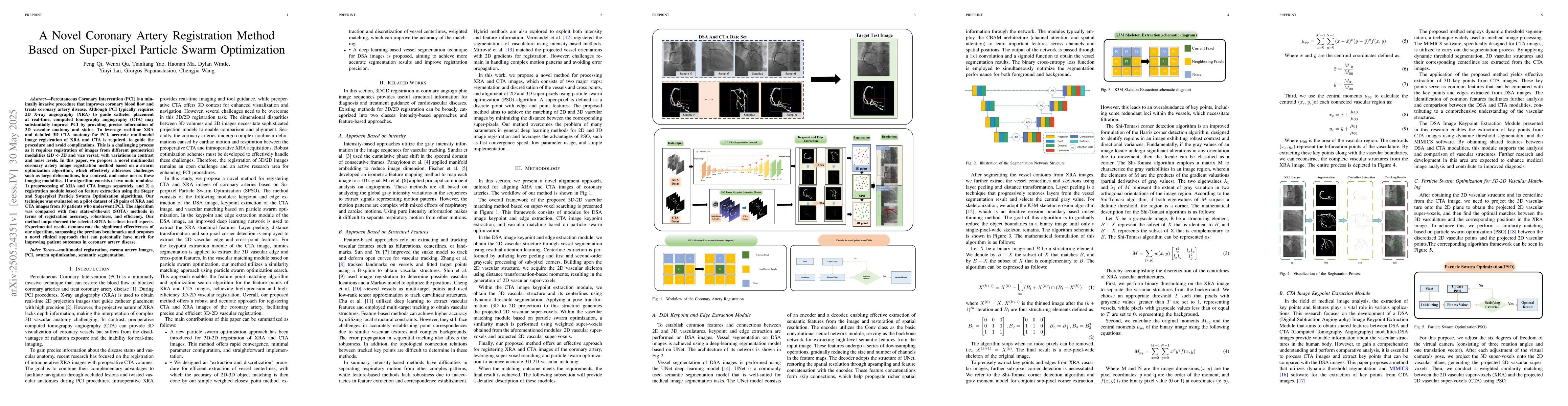 This work is novel due to its application of Superpixel Particle Swarm Optimization for accurate registration of 2D XRA and 3D CTA images, overcoming the challenges of different geometrical modalities, contrast, and noise levels.