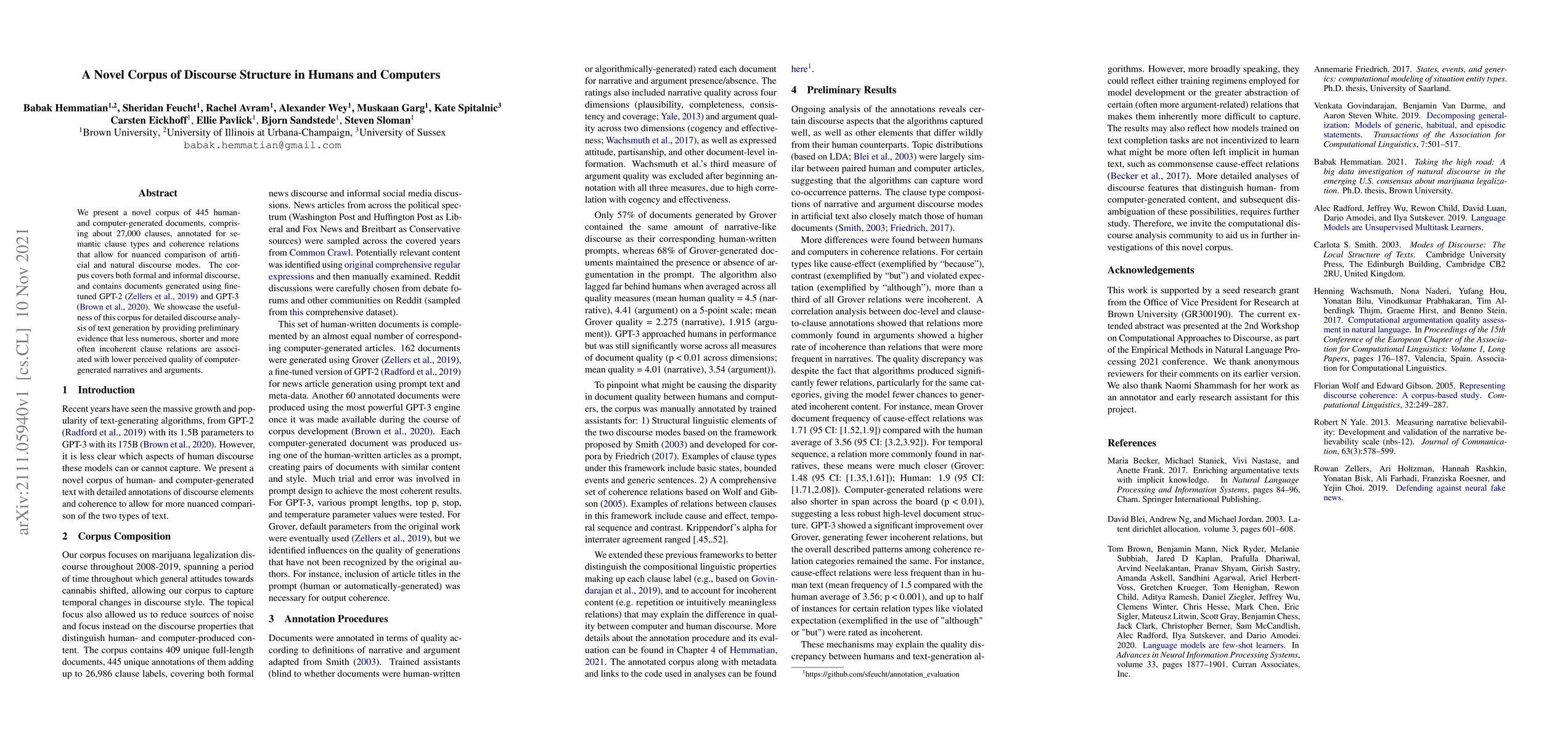 Researchers created a large corpus of human- and computer-generated documents to compare artificial and natural discourse modes. The study found that shorter, less coherent clause relations in AI-generated texts are associated with lower perceived quality.