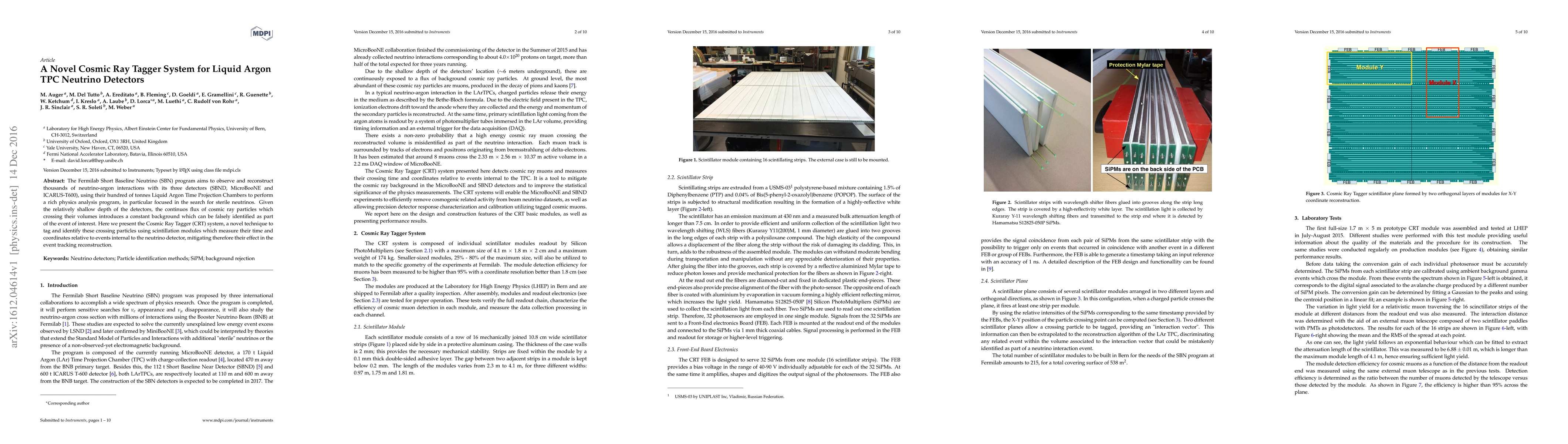 The Fermilab Short Baseline Neutrino program employs a novel Cosmic Ray Tagger (CRT) system to identify and mitigate the background noise from cosmic rays in Liquid Argon TPC neutrino detectors, enhancing the accuracy of neutrino-argon interaction observations. This system uses scintillation modules to tag cosmic rays based on their time and spatial coordinates relative to internal detector events.