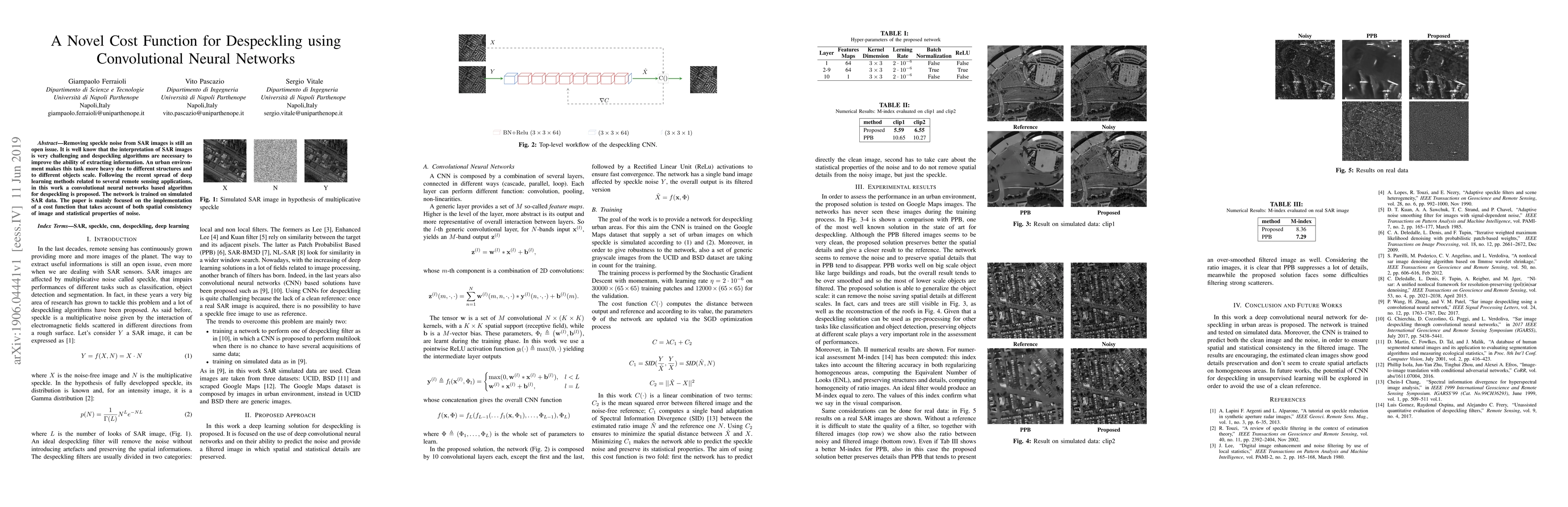 Removing speckle noise from SAR images is still an open issue. It is well know that the interpretation of SAR images is very challenging and despeckling algorithms are necessary to improve the ability of extracting information. An urban environment makes this task more heavy due to different structures and to different objects scale. Following the recent spread of deep learning methods related to several remote sensing applications, in this work a convolutional neural networks based algorithm for despeckling is proposed. The network is trained on simulated SAR data. The paper is mainly focused on the implementation of a cost function that takes account of both spatial consistency of image and statistical properties of noise.