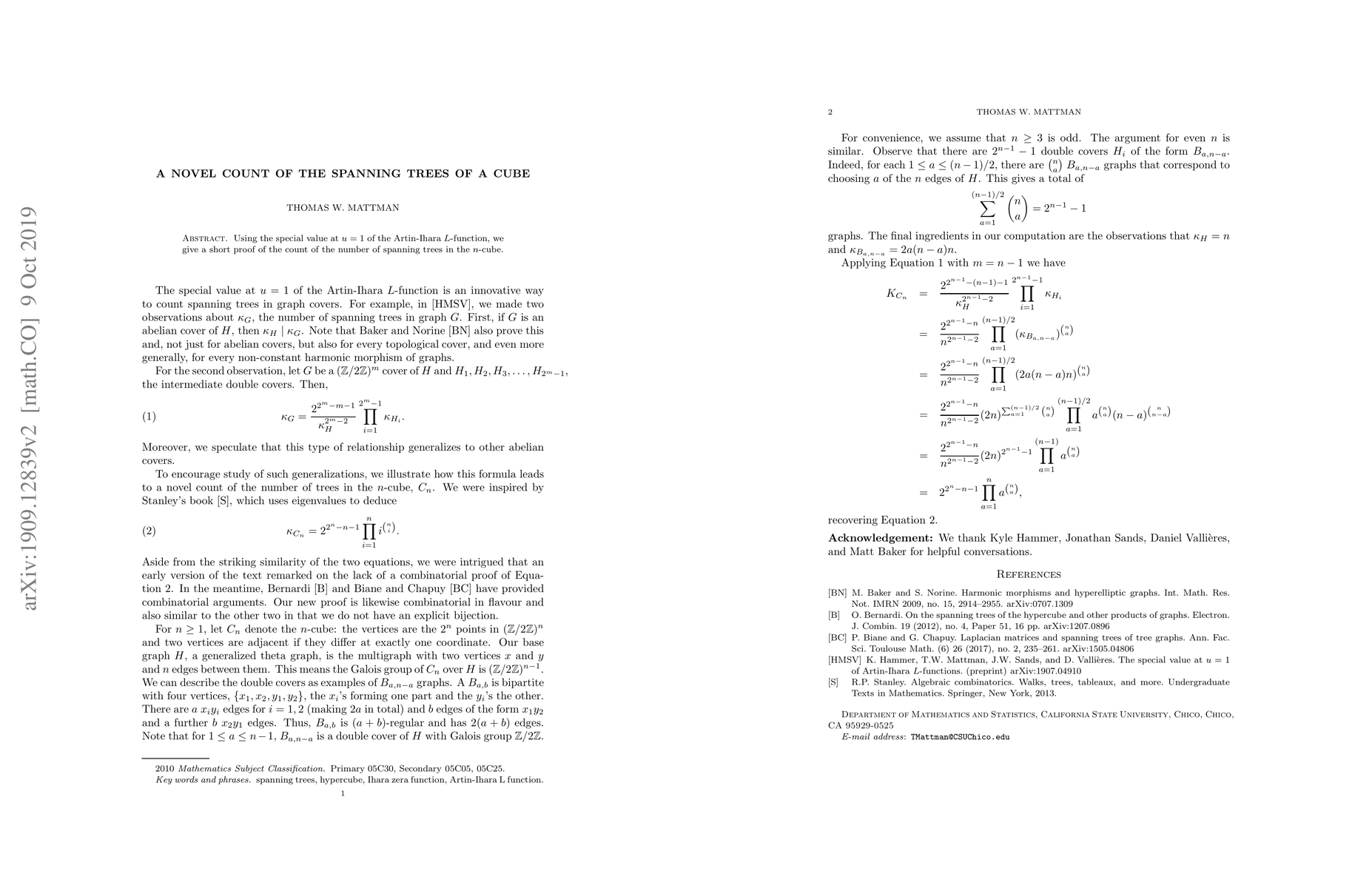 Summary: This paper presents a concise proof for counting the number of spanning trees in the $n$-cube using the Artin-Ihara $L$-function evaluated at $u=1$. The method leverages special properties of the $L$-function to achieve a novel result.