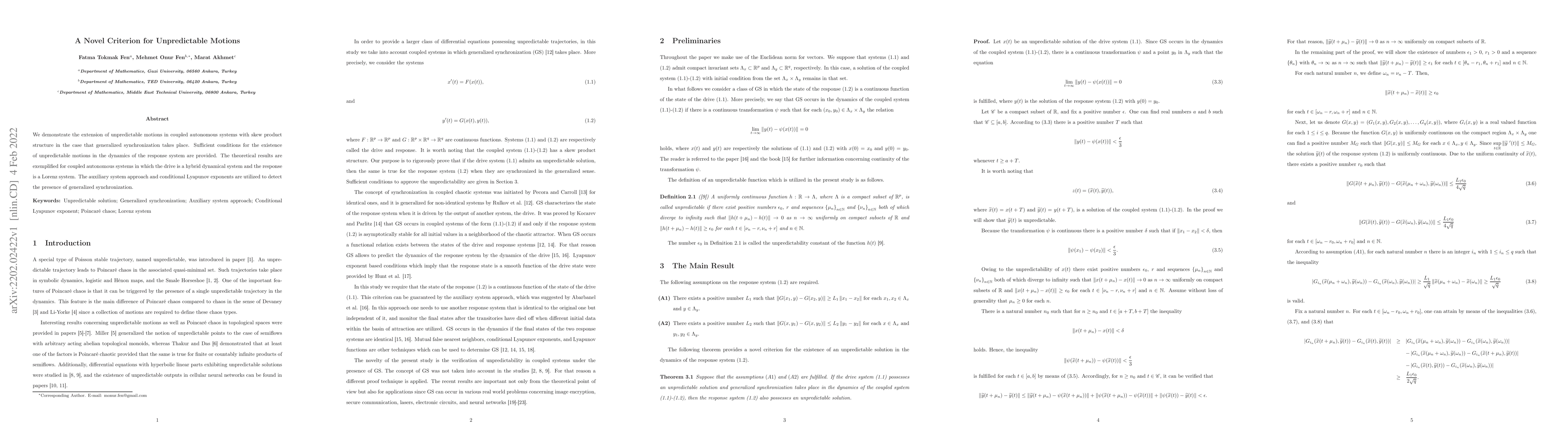 The paper introduces a novel criterion for unpredictable motions in coupled autonomous systems, utilizing generalized synchronization, auxiliary system approach, and conditional Lyapunov exponents.