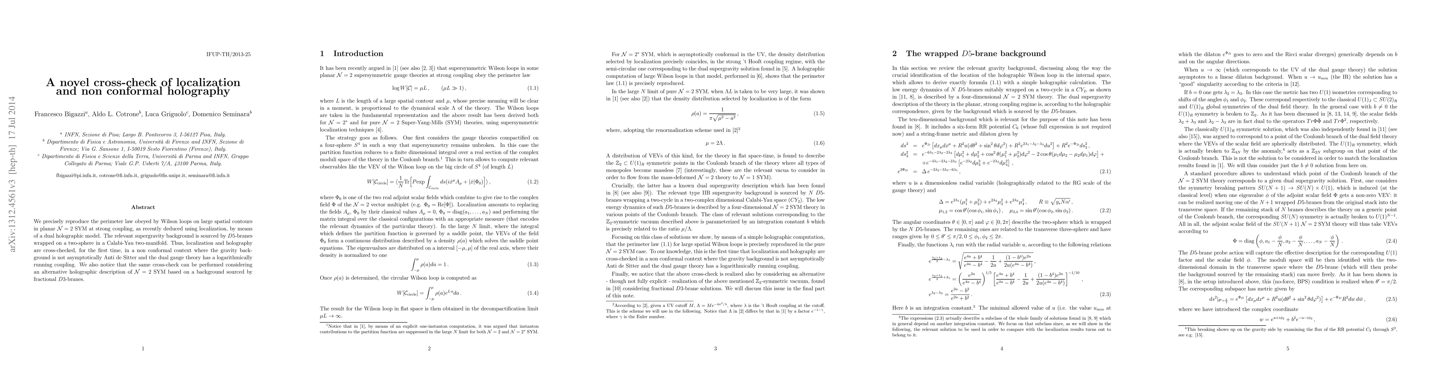 We precisely reproduce the perimeter law obeyed by Wilson loops on large spatial contours in planar N=2 SYM at strong coupling, as recently deduced using localization, by means of a dual holographic model. The relevant supergravity background is sourced by D5-branes wrapped on a two-sphere in a Calabi-Yau two-manifold. Thus, localization and holography are cross-checked, for the first time, in a non conformal context where the gravity background is not asymptotically Anti de Sitter and the dual gauge theory has a logarithmically running coupling. We also notice that the same cross-check can be performed considering an alternative holographic description of N=2 SYM based on a background sourced by fractional D3-branes.