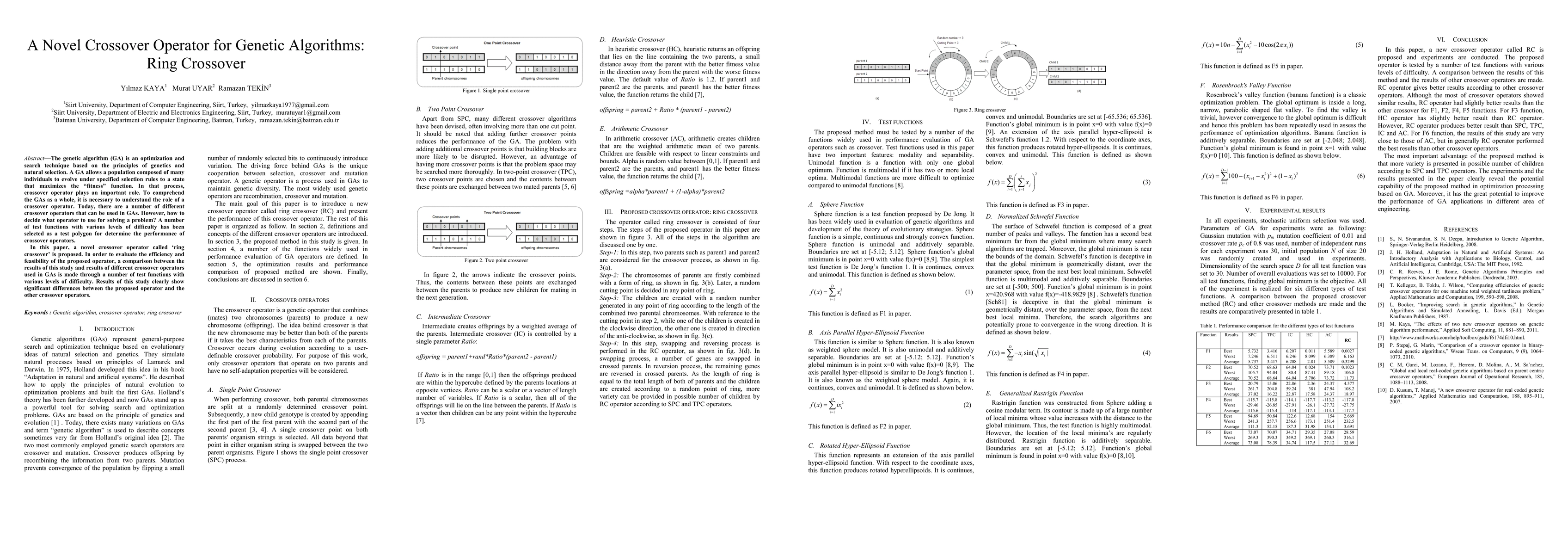 This paper introduces a novel crossover operator called 'ring crossover' for genetic algorithms, which aims to optimize the search process. Comparative analysis against existing crossover operators demonstrates that the proposed method significantly outperforms others across various test functions.