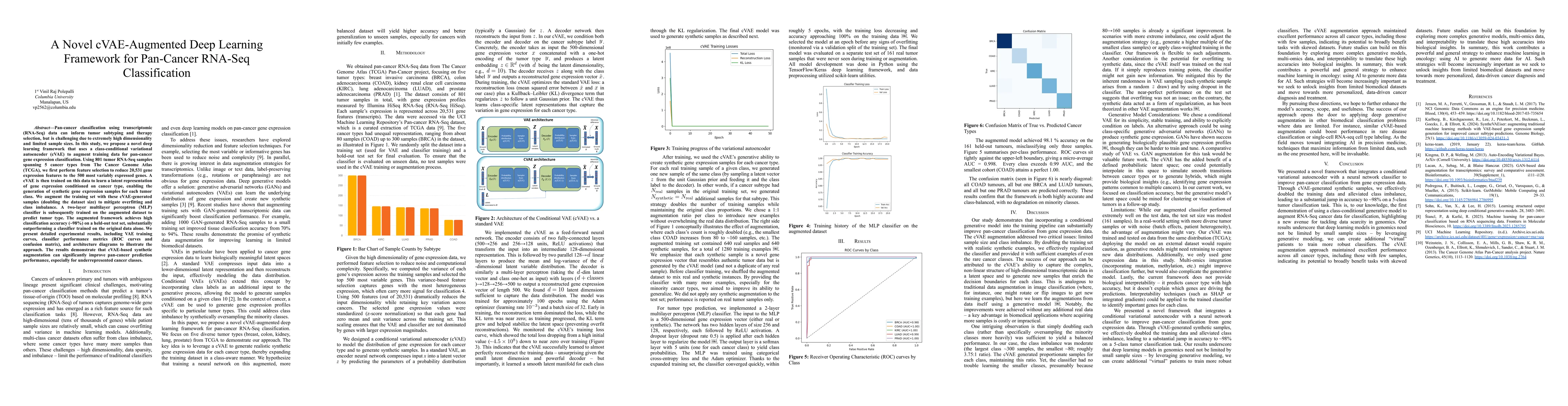 Pan-cancer classification using transcriptomic (RNA-Seq) data can inform tumor subtyping and therapy selection, but is challenging due to extremely high dimensionality and limited sample sizes. In this study, we propose a novel deep learning framework that uses a class-conditional variational autoencoder (cVAE) to augment training data for pan-cancer gene expression classification. Using 801 tumor RNA-Seq samples spanning 5 cancer types from The Cancer Genome Atlas (TCGA), we first perform feature selection to reduce 20,531 gene expression features to the 500 most variably expressed genes. A cVAE is then trained on this data to learn a latent representation of gene expression conditioned on cancer type, enabling the generation of synthetic gene expression samples for each tumor class. We augment the training set with these cVAE-generated samples (doubling the dataset size) to mitigate overfitting and class imbalance. A two-layer multilayer perceptron (MLP) classifier is subsequently trained on the augmented dataset to predict tumor type. The augmented framework achieves high classification accuracy (~98%) on a held-out test set, substantially outperforming a classifier trained on the original data alone. We present detailed experimental results, including VAE training curves, classifier performance metrics (ROC curves and confusion matrix), and architecture diagrams to illustrate the approach. The results demonstrate that cVAE-based synthetic augmentation can significantly improve pan-cancer prediction performance, especially for underrepresented cancer classes.