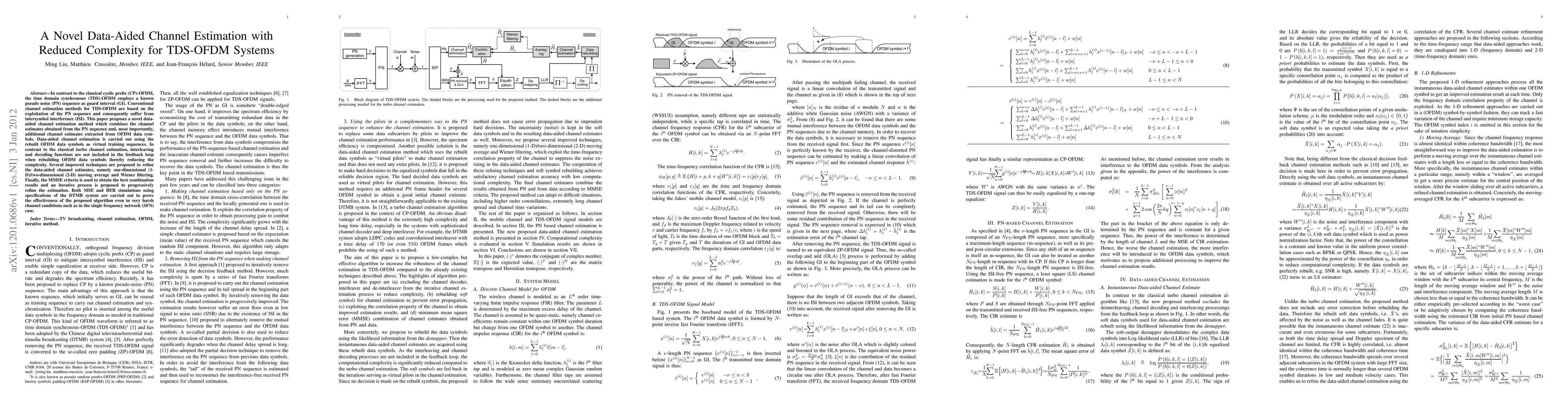 This paper proposes a novel data-aided channel estimation method for TDS-OFDM systems, combining estimates from the PN sequence and OFDM data symbols to reduce intersymbol interference. The approach excludes interleaving and decoding to lower complexity, employing techniques like 1-D/2-D moving average and Wiener filtering for refinement, and iterative MMSE criteria for optimal results.