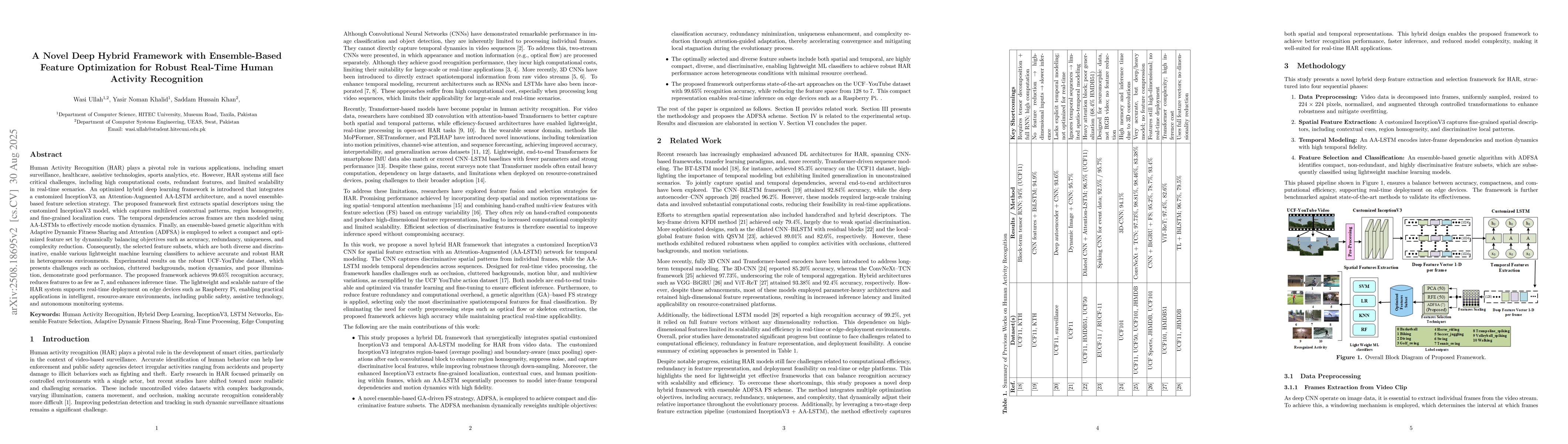 Human Activity Recognition (HAR) plays a pivotal role in various applications, including smart surveillance, healthcare, assistive technologies, sports analytics, etc. However, HAR systems still face critical challenges, including high computational costs, redundant features, and limited scalability in real-time scenarios. An optimized hybrid deep learning framework is introduced that integrates a customized InceptionV3, an LSTM architecture, and a novel ensemble-based feature selection strategy. The proposed framework first extracts spatial descriptors using the customized InceptionV3 model, which captures multilevel contextual patterns, region homogeneity, and fine-grained localization cues. The temporal dependencies across frames are then modeled using LSTMs to effectively encode motion dynamics. Finally, an ensemble-based genetic algorithm with Adaptive Dynamic Fitness Sharing and Attention (ADFSA) is employed to select a compact and optimized feature set by dynamically balancing objectives such as accuracy, redundancy, uniqueness, and complexity reduction. Consequently, the selected feature subsets, which are both diverse and discriminative, enable various lightweight machine learning classifiers to achieve accurate and robust HAR in heterogeneous environments. Experimental results on the robust UCF-YouTube dataset, which presents challenges such as occlusion, cluttered backgrounds, motion dynamics, and poor illumination, demonstrate good performance. The proposed approach achieves 99.65% recognition accuracy, reduces features to as few as 7, and enhances inference time. The lightweight and scalable nature of the HAR system supports real-time deployment on edge devices such as Raspberry Pi, enabling practical applications in intelligent, resource-aware environments, including public safety, assistive technology, and autonomous monitoring systems.