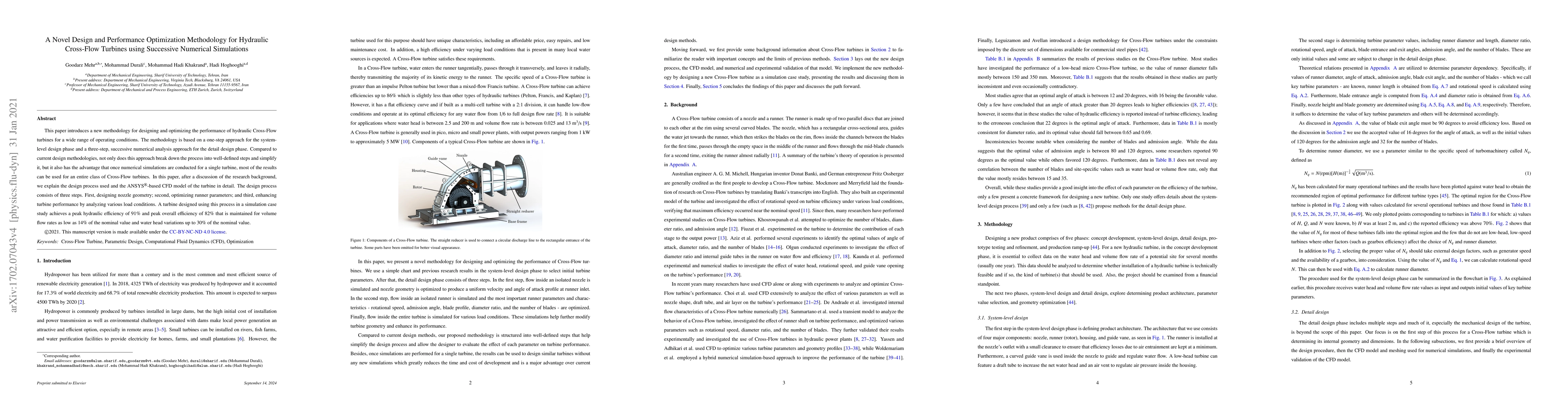 A novel design methodology for hydraulic Cross-Flow turbines is introduced, achieving high efficiency rates of 91% peak hydraulic efficiency and 82% peak overall efficiency under various operating conditions.