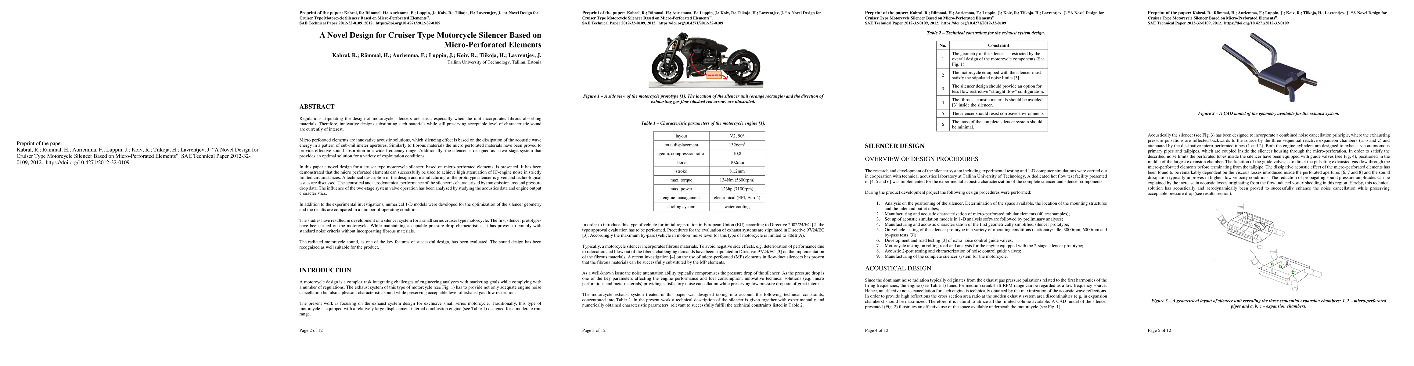 ...Micro perforated elements are innovative acoustic solutions,which silencing effect is based on the dissipation of the acoustic wave energy in a pattern of sub-millimeter apertures. Similarly to fibrous materials the micro-perforated materials have been proved to provide effective sound absorption in a wide frequency range. Additionally, the silencer is designed as a two-stage system that provides an optimal solution for a variety of exploitation conditions. In this paper a novel design for a cruiser type motorcycle silencer, based on micro-perforated elements, is presented. It has been demonstrated that the micro-perforated elements can successfully be used to achieve high attenuation of IC-engine noise in strictly limited circumstances. A technical description of the design and manufacturing of the prototype silencer is given and technological issues are discussed. The acoustical and fluid-dynamical performance of the silencer is characterized by transmission loss and pressure drop data. The influence of the two-stage system valve operation has been analyzed by studying the acoustics data and engine output characteristics. In addition to the experimental investigations, numerical 1-D models were developed for the optimization of the silencer geometry and the results are compared in a number of operating conditions. The studies have resulted in development of a silencer system for a small series cruiser type motorcycle. The first silencer prototypes have been tested on the motorcycle. While maintaining acceptable pressure drop characteristics, it has proven to comply with standard noise criteria without incorporating fibrous materials....