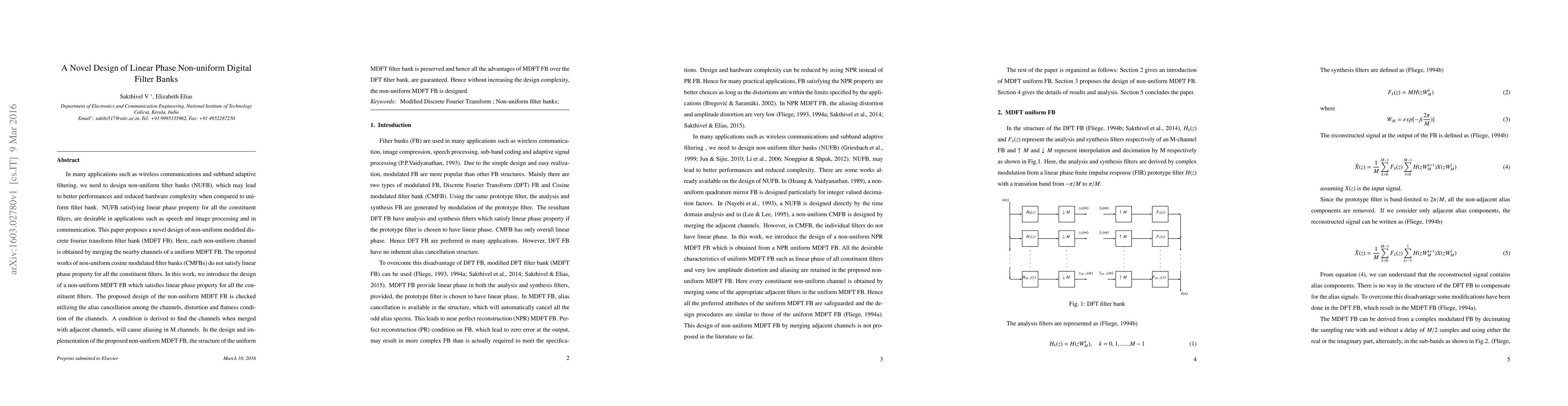 In many applications such as wireless communications and subband adaptive filtering, we need to design non-uniform filter banks (NUFB), which may lead to better performances and reduced hardware complexity when compared to uniform filter bank. NUFB satisfying linear phase property for all the constituent filters, are desirable in applications such as speech and image processing and in communication. This paper proposes a novel design of non-uniform modified discrete fourier transform filter bank (MDFT FB). Here, each non-uniform channel is obtained by merging the nearby channels of a uniform MDFT FB. The reported works of non-uniform cosine modulated filter banks (CMFBs) do not satisfy linear phase property for all the constituent filters. In this work, we introduce the design of a non-uniform MDFT FB which satisfies linear phase property for all the constituent filters. The proposed design of the non-uniform MDFT FB is checked utilizing the alias cancellation among the channels, distortion and flatness condition of the channels. A condition is derived to find the channels when merged with adjacent channels, will cause aliasing in M channels. In the design and implementation of the proposed non-uniform MDFT FB, the structure of the uniform MDFT filter bank is preserved and hence all the advantages of MDFT FB over the DFT filter bank, are guaranteed. Hence without increasing the design complexity, the non-uniform MDFT FB is designed.