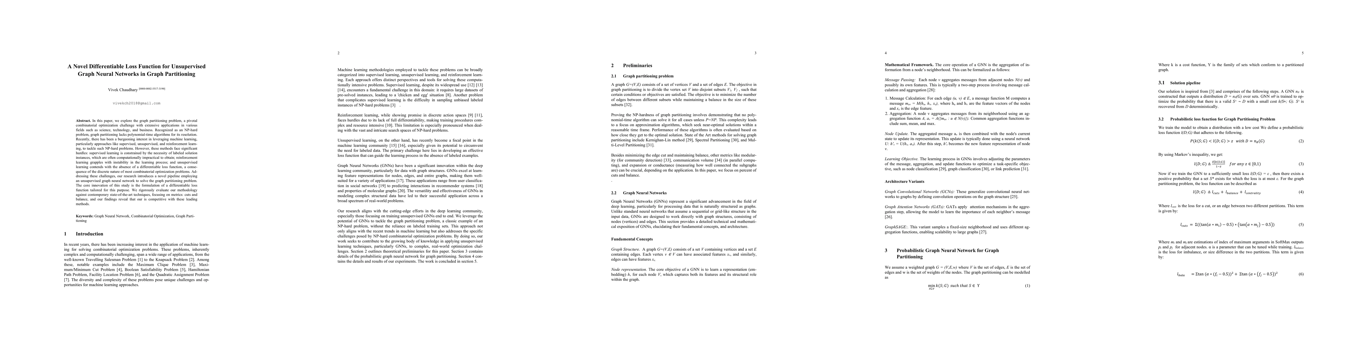 In this paper, we explore the graph partitioning problem, a pivotal combina-torial optimization challenge with extensive applications in various fields such as science, technology, and business. Recognized as an NP-hard prob-lem, graph partitioning lacks polynomial-time algorithms for its resolution. Recently, there has been a burgeoning interest in leveraging machine learn-ing, particularly approaches like supervised, unsupervised, and reinforce-ment learning, to tackle such NP-hard problems. However, these methods face significant hurdles: supervised learning is constrained by the necessity of labeled solution instances, which are often computationally impractical to obtain; reinforcement learning grapples with instability in the learning pro-cess; and unsupervised learning contends with the absence of a differentia-ble loss function, a consequence of the discrete nature of most combinatorial optimization problems. Addressing these challenges, our research introduces a novel pipeline employing an unsupervised graph neural network to solve the graph partitioning problem. The core innovation of this study is the for-mulation of a differentiable loss function tailored for this purpose. We rigor-ously evaluate our methodology against contemporary state-of-the-art tech-niques, focusing on metrics: cuts and balance, and our findings reveal that our is competitive with these leading methods.