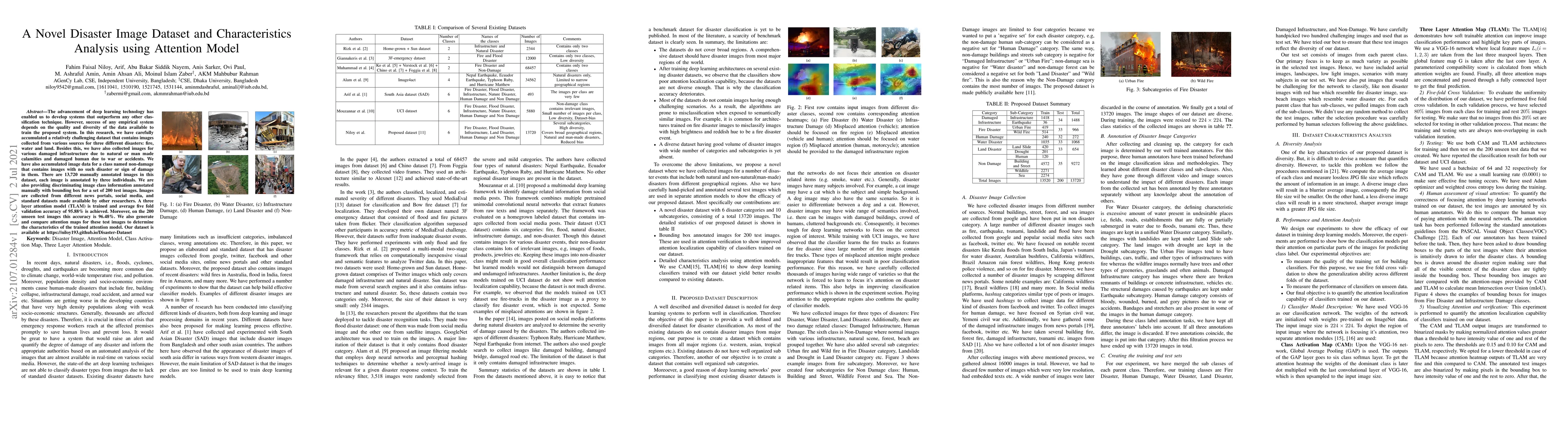 The advancement of deep learning technology has enabled us to develop systems that outperform any other classification technique. However, success of any empirical system depends on the quality and diversity of the data available to train the proposed system. In this research, we have carefully accumulated a relatively challenging dataset that contains images collected from various sources for three different disasters: fire, water and land. Besides this, we have also collected images for various damaged infrastructure due to natural or man made calamities and damaged human due to war or accidents. We have also accumulated image data for a class named non-damage that contains images with no such disaster or sign of damage in them. There are 13,720 manually annotated images in this dataset, each image is annotated by three individuals. We are also providing discriminating image class information annotated manually with bounding box for a set of 200 test images. Images are collected from different news portals, social media, and standard datasets made available by other researchers. A three layer attention model (TLAM) is trained and average five fold validation accuracy of 95.88% is achieved. Moreover, on the 200 unseen test images this accuracy is 96.48%. We also generate and compare attention maps for these test images to determine the characteristics of the trained attention model. Our dataset is available at https://niloy193.github.io/Disaster-Dataset