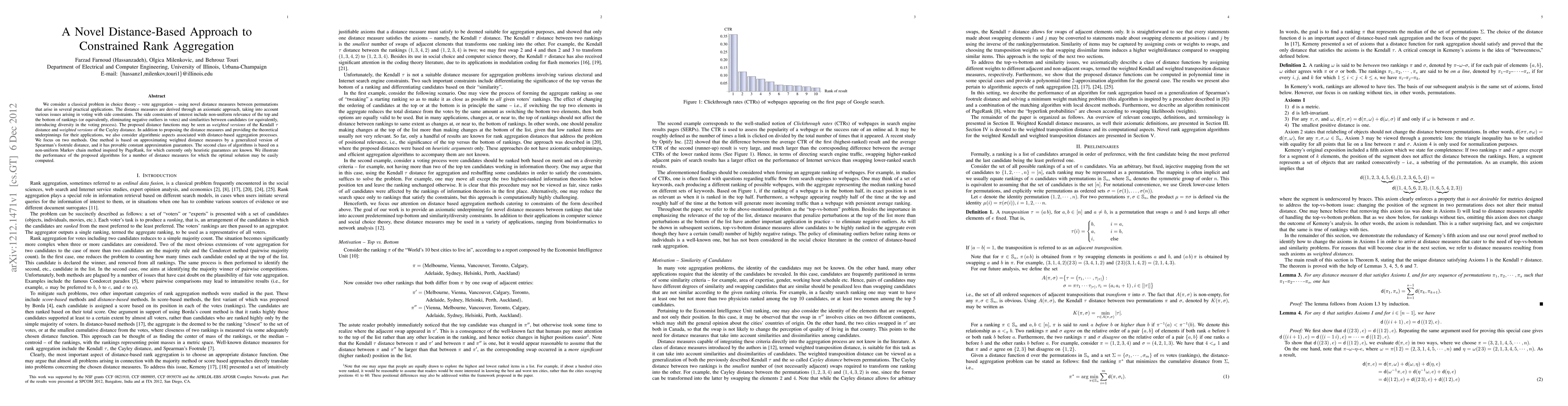 This paper introduces novel distance measures for constrained rank aggregation in vote aggregation, derived from an axiomatic approach to address issues like eliminating negative outliers and introducing candidate diversity. The study proposes two algorithmic methods for aggregation, one with constant approximation guarantees and another based on a non-uniform Markov chain inspired by PageRank.