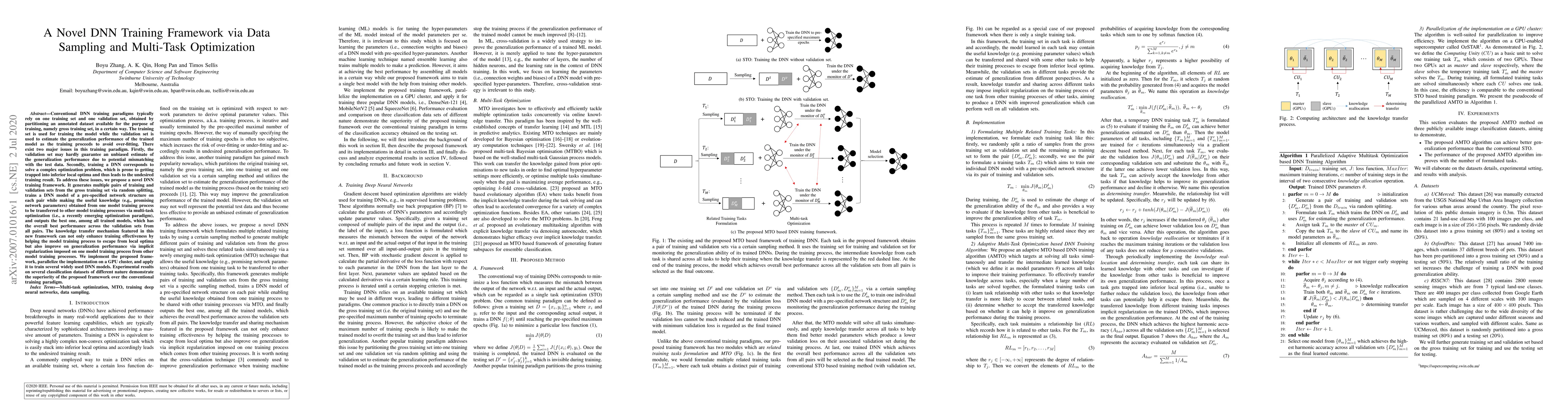 This paper proposes a novel DNN training framework that addresses issues of biased validation estimates and local optima by generating multiple training-validation pairs and employing multi-task optimization for knowledge transfer. Experimental results show improved generalization performance and training effectiveness compared to conventional methods.