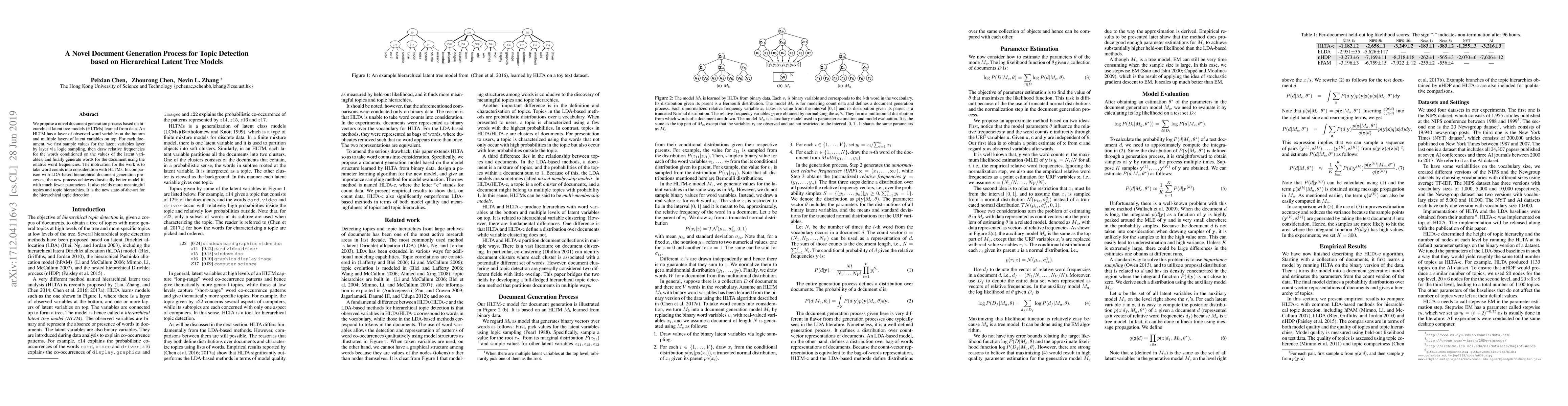 This paper introduces a novel document generation process using hierarchical latent tree models (HLTMs) that better fits data and generates more meaningful topics compared to LDA-based methods, achieving superior model fit with fewer parameters. The process samples latent variables and generates words based on relative frequencies conditioned on these variables.