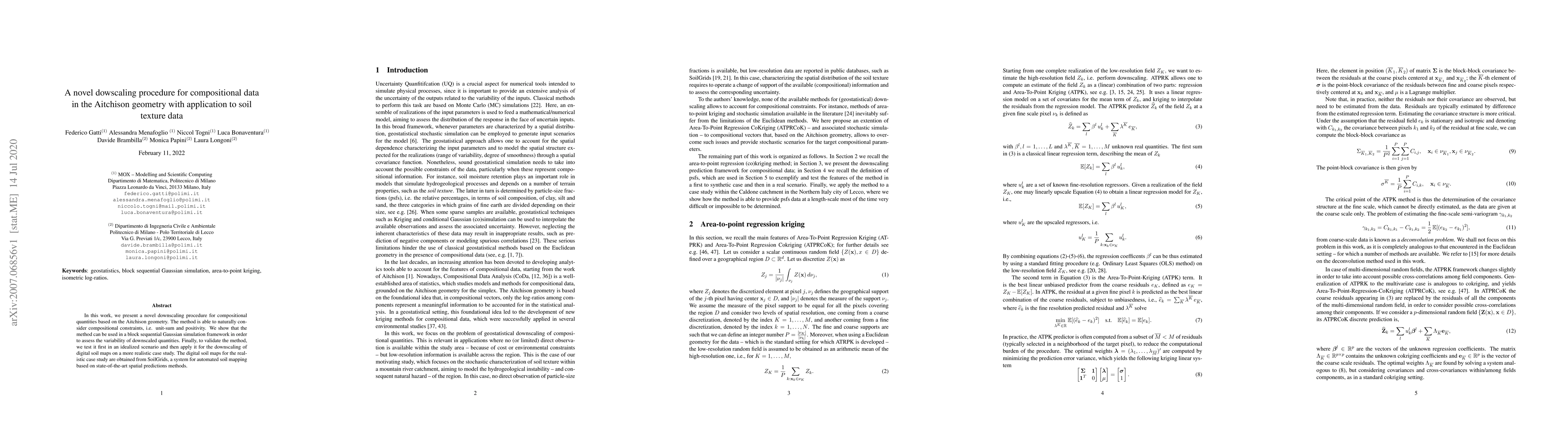 This paper introduces a new downscaling method for compositional data in the Aitchison geometry, which respects compositional constraints like unit-sum and positivity. The method is validated through both idealized scenarios and a real-world application to soil texture data from SoilGrids.