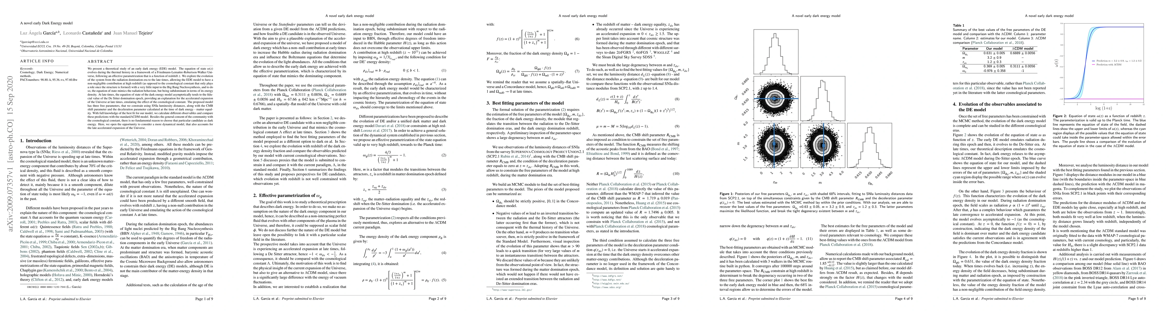We present a theoretical study of an early dark energy (EDE) model. The equation of state $\omega(z)$ evolves during the thermal history in a framework of a Friedmann-Lemaitre-Robertson-Walker Universe, following an effective parametrization that is a function of redshift $z$. We explore the evolution of the system from the radiation domination era to the late times, allowing the EDE model to have a non-negligible contribution at high redshift (as opposed to the cosmological constant that only plays a role once the structure is formed) with a very little input to the Big Bang Nucleosynthesis, and to do so, the equation of state mimics the radiation behaviour, but being subdominant in terms of its energy density. At late times, the equation of state of the dark energy model asymptotically tends to the fiducial value of the De Sitter domination epoch, providing an explanation for the accelerated expansion of the Universe at late times, emulating the effect of the cosmological constant. The proposed model has three free parameters, that we constrain using SNIa luminosity distances, along with the CMB shift parameter and the deceleration parameter calculated at the time of dark energy - matter equality. With full knowledge of the best fit for our model, we calculate different observables and compare these predictions with the standard$\Lambda$CDM model. Besides the general consent of the community with the cosmological constant, there is no fundamental reason to choose that particular candidate as dark energy. Here, we open the opportunity to consider a more dynamical model, that also accounts for the late accelerated expansion of the Universe.