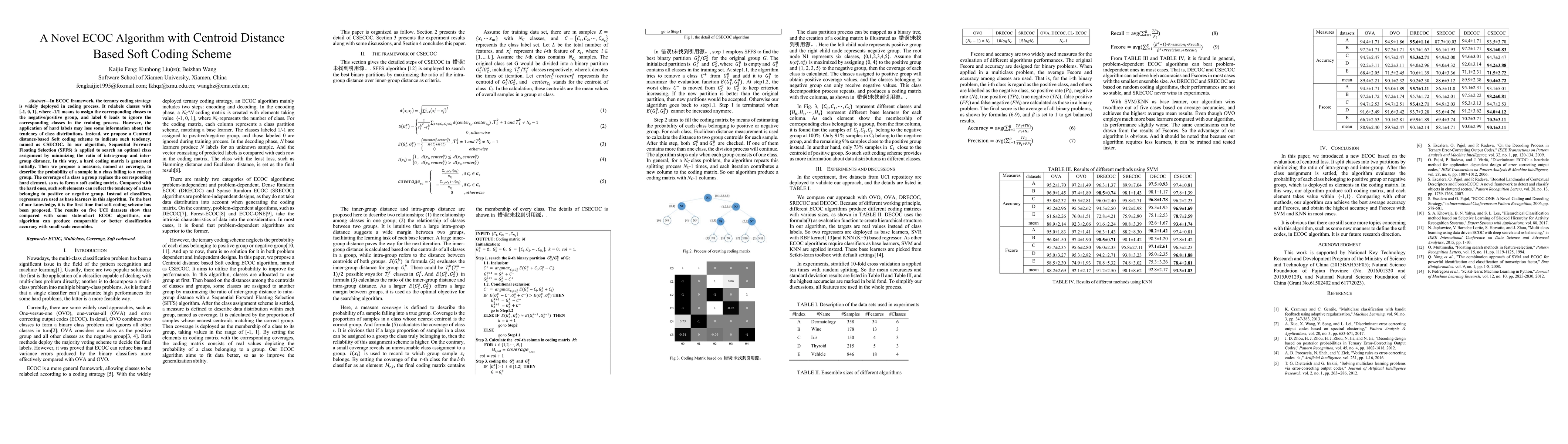 In ECOC framework, the ternary coding strategy is widely deployed in coding process. It relabels classes with {"-1,0,1" }, where -1/1 means to assign the corresponding classes to the negative/positive group, and label 0 leads to ignore the corresponding classes in the training process. However, the application of hard labels may lose some information about the tendency of class distributions. Instead, we propose a Centroid distance-based Soft coding scheme to indicate such tendency, named as CSECOC. In our algorithm, Sequential Forward Floating Selection (SFFS) is applied to search an optimal class assignment by minimizing the ratio of intra-group and inter-group distance. In this way, a hard coding matrix is generated initially. Then we propose a measure, named as coverage, to describe the probability of a sample in a class falling to a correct group. The coverage of a class a group replace the corresponding hard element, so as to form a soft coding matrix. Compared with the hard ones, such soft elements can reflect the tendency of a class belonging to positive or negative group. Instead of classifiers, regressors are used as base learners in this algorithm. To the best of our knowledge, it is the first time that soft coding scheme has been proposed. The results on five UCI datasets show that compared with some state-of-art ECOC algorithms, our algorithm can produce comparable or better classification accuracy with small scale ensembles.