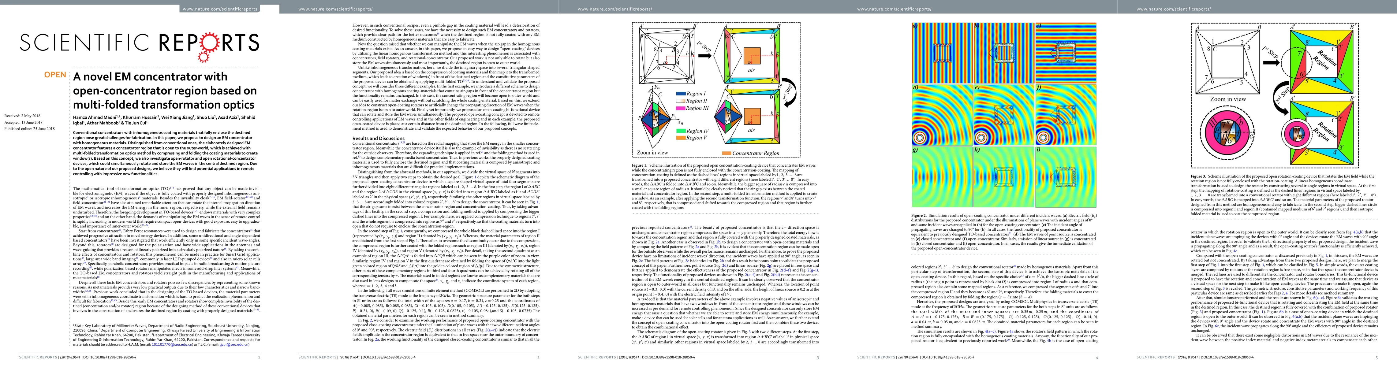 This paper proposes a novel electromagnetic (EM) concentrator using homogeneous materials and multi-folded transformation optics to create an open concentrator region. The design allows for potential applications in remote control with new functionalities by enabling simultaneous rotation and storage of EM waves.