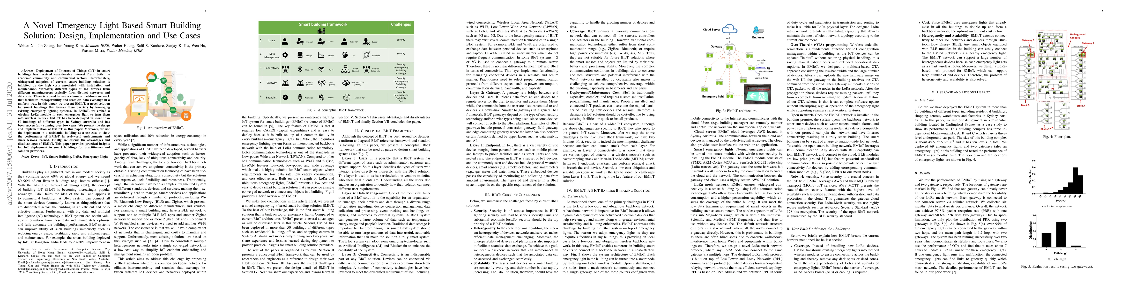 Deployment of Internet of Things (IoT) in smart buildings has received considerable interest from both the academic community and commercial sectors. Unfortunately, widespread adoption of current smart building solutions is inhibited by the high costs associated with installation and maintenance. Moreover, different types of IoT devices from different manufacturers typically form distinct networks and data silos. There is a need to use a common backbone network that facilitates interoperability and seamless data exchange in a uniform way. In this paper, we present EMIoT, a novel solution for smart buildings that breaks these barriers by leveraging existing emergency lighting systems. In EMIoT, we embed a wireless LoRa module in each emergency light to turn them into wireless routers. EMIoT has been deployed in more than 50 buildings of different types in Sydney Australia and has been successfully running over two years. We present the design and implementation of EMIoT in this paper. Moreover, we use the deployment in a residential building as a use case to show the performance of EMIoT in real-world environments and share lessons learned. Finally, we discuss the advantages and disadvantages of EMIoT. This paper provides practical insights for IoT deployment in smart buildings for practitioners and solution providers.