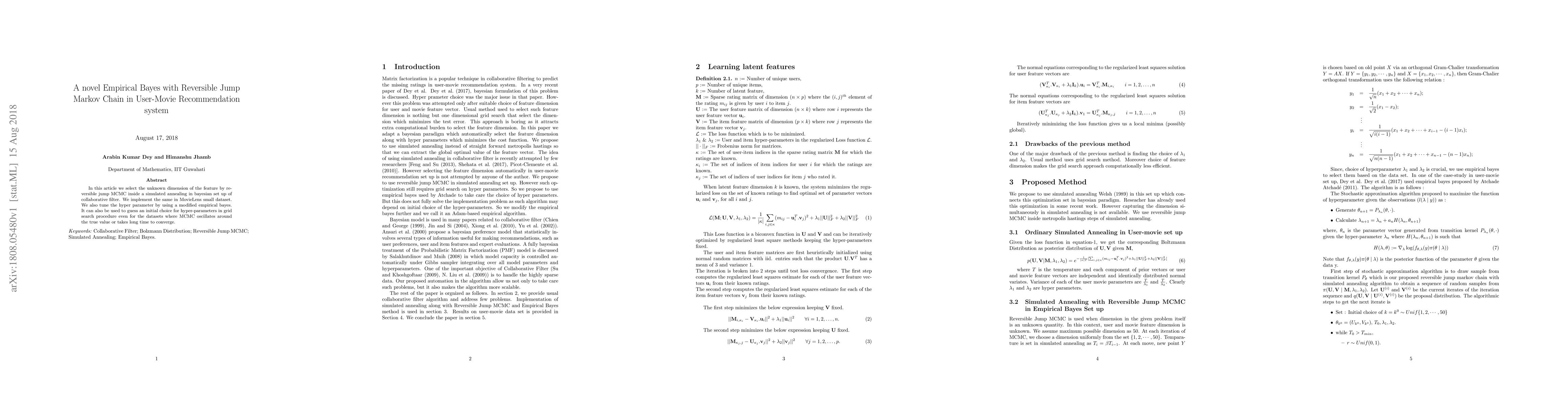 In this article we select the unknown dimension of the feature by re- versible jump MCMC inside a simulated annealing in bayesian set up of collaborative filter. We implement the same in MovieLens small dataset. We also tune the hyper parameter by using a modified empirical bayes. It can also be used to guess an initial choice for hyper-parameters in grid search procedure even for the datasets where MCMC oscillates around the true value or takes long time to converge.