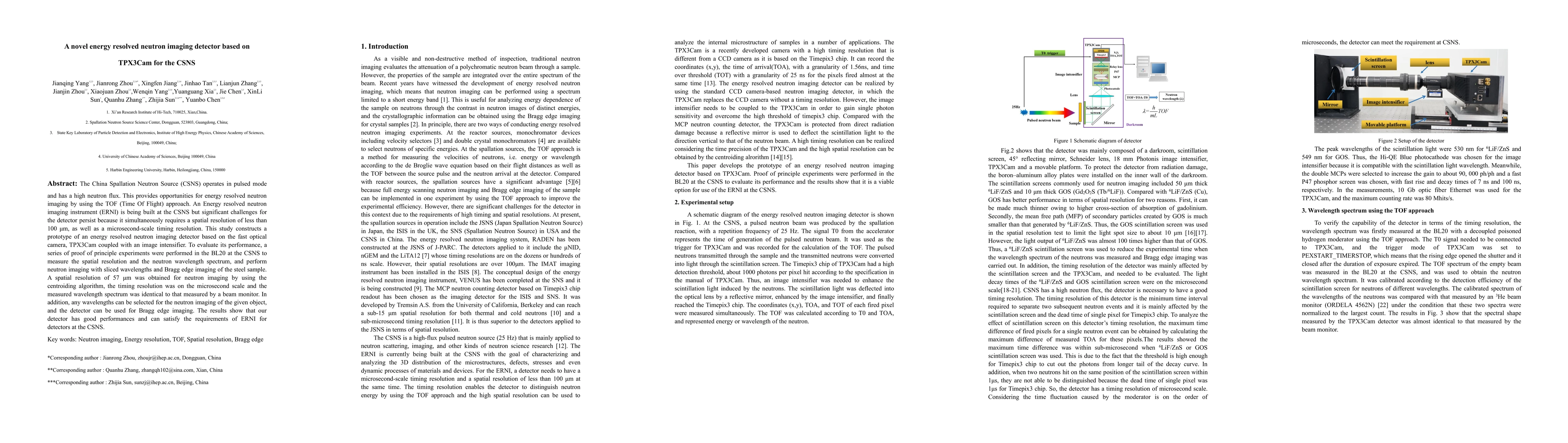 The China Spallation Neutron Source (CSNS) operates in pulsed mode and has a high neutron flux. This provides opportunities for energy resolved neutron imaging by using the TOF (Time Of Flight) approach. An Energy resolved neutron imaging instrument (ERNI) is being built at the CSNS but significant challenges for the detector persist because it simultaneously requires a spatial resolution of less than 100 {\mu}m, as well as a microsecond-scale timing resolution. This study constructs a prototype of an energy resolved neutron imaging detector based on the fast optical camera, TPX3Cam coupled with an image intensifier. To evaluate its performance, a series of proof of principle experiments were performed in the BL20 at the CSNS to measure the spatial resolution and the neutron wavelength spectrum, and perform neutron imaging with sliced wavelengths and Bragg edge imaging of the steel sample. A spatial resolution of 57 {\mu}m was obtained for neutron imaging by using the centroiding algorithm, the timing resolution was on the microsecond scale and the measured wavelength spectrum was identical to that measured by a beam monitor. In addition, any wavelengths can be selected for the neutron imaging of the given object, and the detector can be used for Bragg edge imaging. The results show that our detector has good performances and can satisfy the requirements of ERNI for detectors at the CSNS