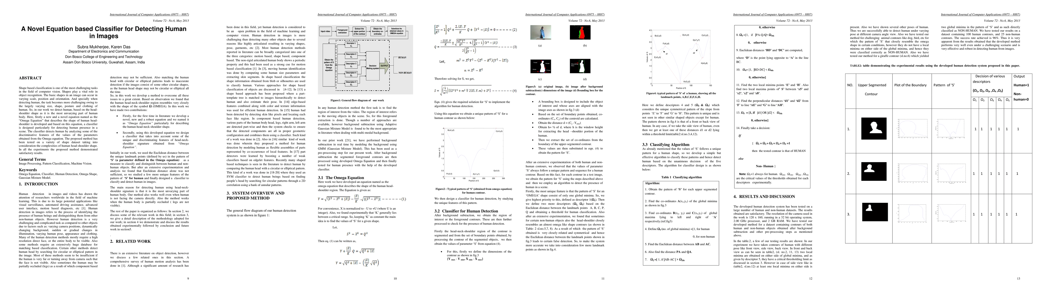 Shape based classification is one of the most challenging tasks in the field of computer vision. Shapes play a vital role in object recognition. The basic shapes in an image can occur in varying scale, position and orientation. And specially when detecting human, the task becomes more challenging owing to the largely varying size, shape, posture and clothing of human. So, in our work we detect human, based on the head-shoulder shape as it is the most unvarying part of human body. Here, firstly a new and a novel equation named as the Omega Equation that describes the shape of human head-shoulder is developed and based on this equation, a classifier is designed particularly for detecting human presence in a scene. The classifier detects human by analyzing some of the discriminative features of the values of the parameters obtained from the Omega equation. The proposed method has been tested on a variety of shape dataset taking into consideration the complexities of human head-shoulder shape. In all the experiments the proposed method demonstrated satisfactory results.