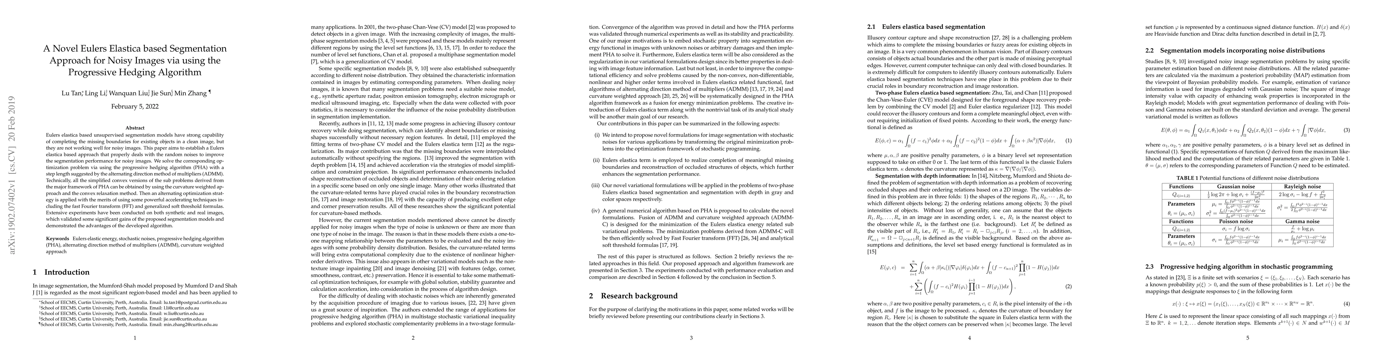 This paper proposes a novel Euler's Elastica based segmentation approach for noisy images using the progressive hedging algorithm (PHA) and alternating direction method of multipliers (ADMM). The method effectively handles noise and improves segmentation performance, validated through experiments on synthetic and real images.