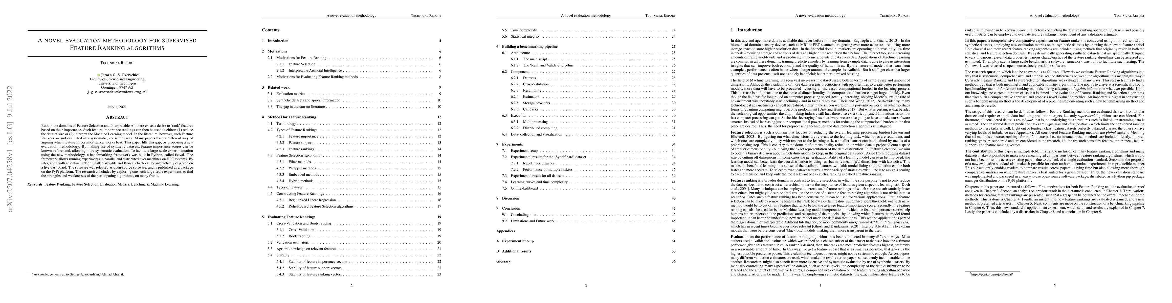 This paper introduces a novel evaluation methodology for assessing supervised Feature Ranking algorithms, addressing the lack of systematic evaluation in the literature. It proposes a benchmarking framework, fseval, for large-scale experimentation using synthetic datasets, and releases the software as open-source to facilitate comparative analysis.