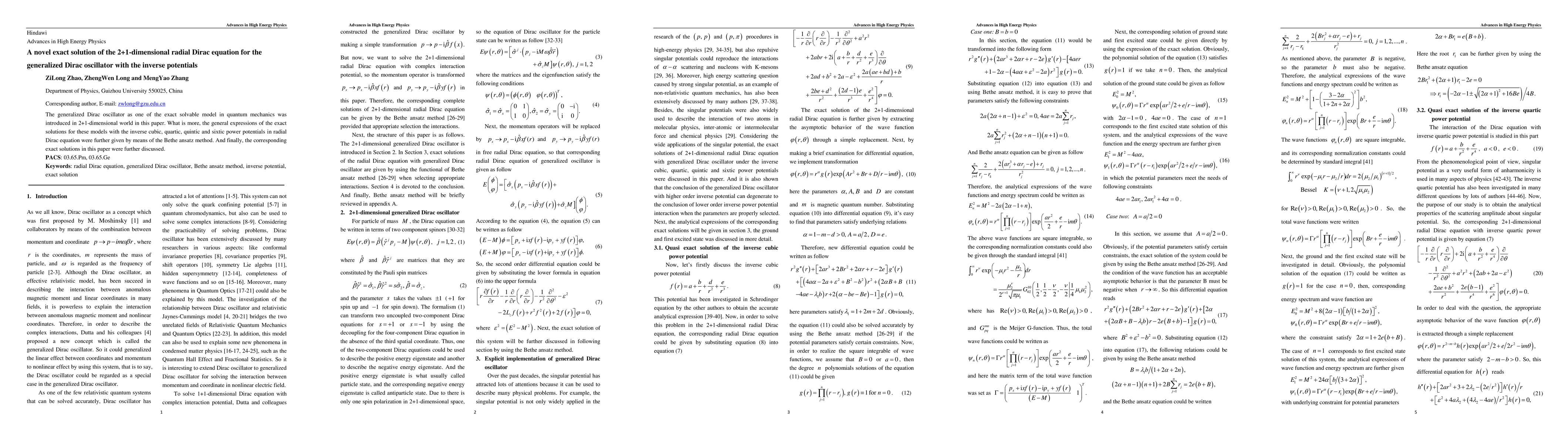 The generalized Dirac oscillator as one of the exact solvable model in quantum mechanics was introduced in 2+1-dimensional world in this paper. What is more, the general expressions of the exact solutions for these models with the inverse cubic, quartic, quintic and sixtic power potentials in radial Dirac equation were further given by means of the Bethe ansatz method. And finally, the corresponding exact solutions in this paper were further discussed.