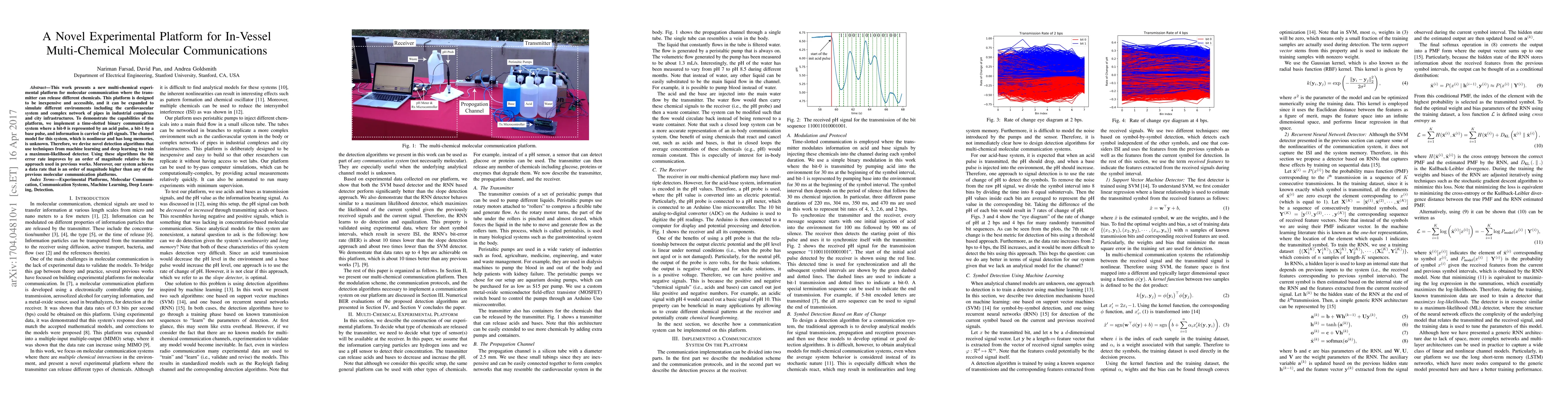 This work presents a new multi-chemical experimental platform for molecular communication where the transmitter can release different chemicals. This platform is designed to be inexpensive and accessible, and it can be expanded to simulate different environments including the cardiovascular system and complex network of pipes in industrial complexes and city infrastructures. To demonstrate the capabilities of the platform, we implement a time-slotted binary communication system where a bit-0 is represented by an acid pulse, a bit-1 by a base pulse, and information is carried via pH signals. The channel model for this system, which is nonlinear and has long memories, is unknown. Therefore, we devise novel detection algorithms that use techniques from machine learning and deep learning to train a maximum-likelihood detector. Using these algorithms the bit error rate improves by an order of magnitude relative to the approach used in previous works. Moreover, our system achieves a data rate that is an order of magnitude higher than any of the previous molecular communication platforms.
