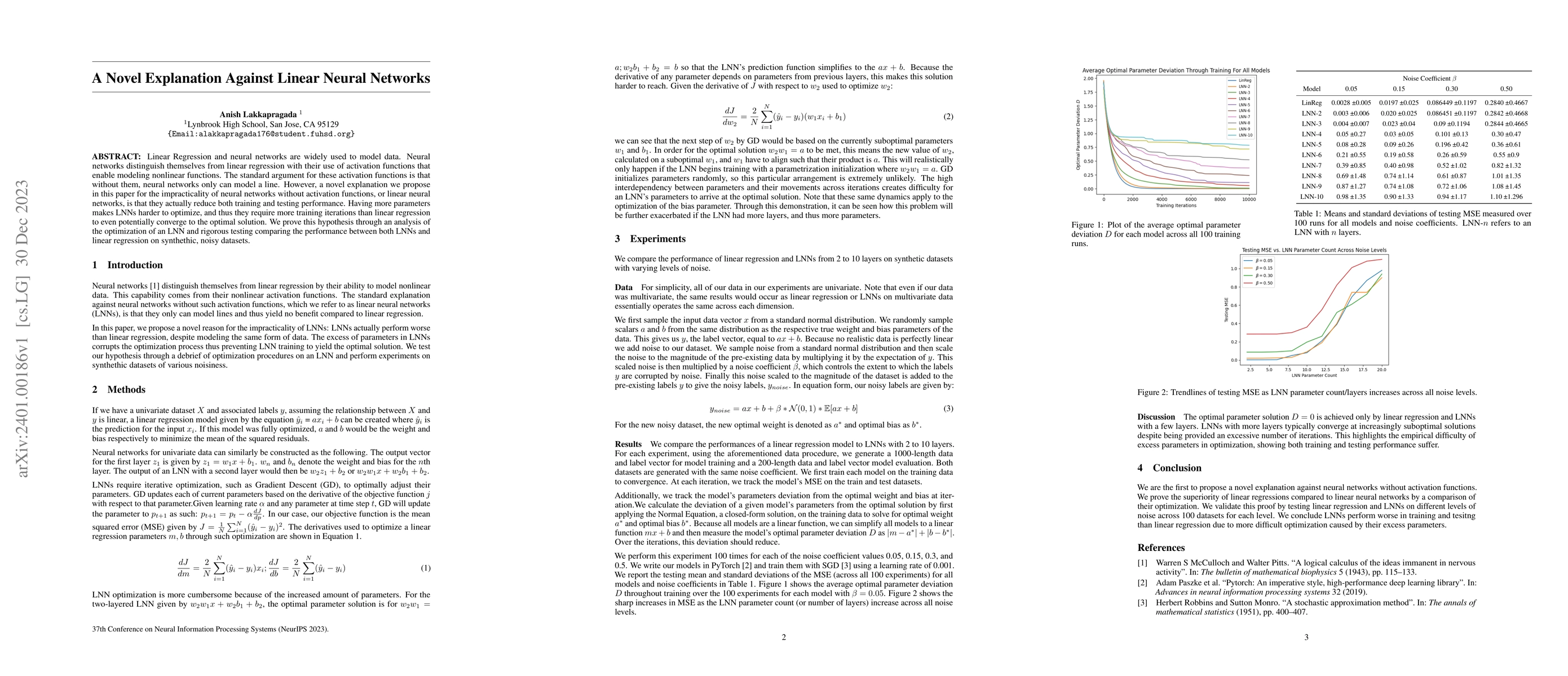 Linear Regression and neural networks are widely used to model data. Neural networks distinguish themselves from linear regression with their use of activation functions that enable modeling nonlinear functions. The standard argument for these activation functions is that without them, neural networks only can model a line. However, a novel explanation we propose in this paper for the impracticality of neural networks without activation functions, or linear neural networks, is that they actually reduce both training and testing performance. Having more parameters makes LNNs harder to optimize, and thus they require more training iterations than linear regression to even potentially converge to the optimal solution. We prove this hypothesis through an analysis of the optimization of an LNN and rigorous testing comparing the performance between both LNNs and linear regression on synthethic, noisy datasets.