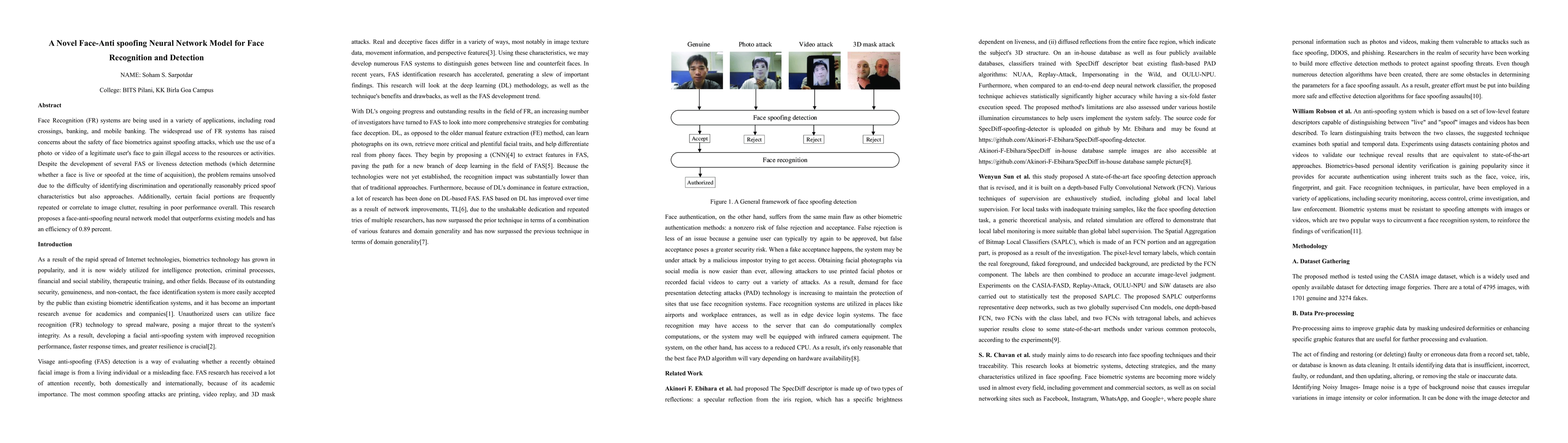 This research introduces a novel neural network model for face-anti spoofing to enhance face recognition security, addressing the challenges posed by spoofing attacks. The proposed model achieves superior performance with an efficiency rate of 0.89 percent, outperforming existing liveness detection methods.
