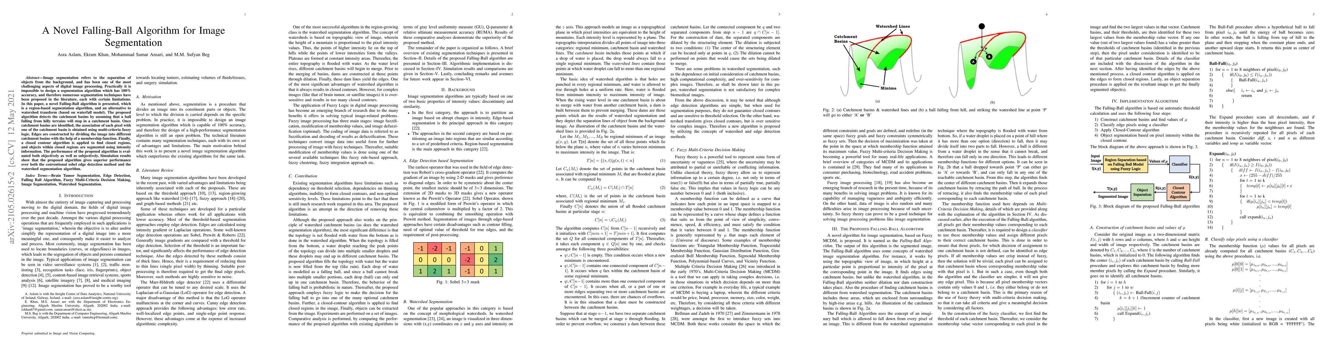 This paper introduces a novel Falling-Ball algorithm for image segmentation, which identifies catchment basins and uses fuzzy logic to associate pixels, outperforming conventional Sobel edge detection and the watershed transform in both objective and subjective evaluations.
