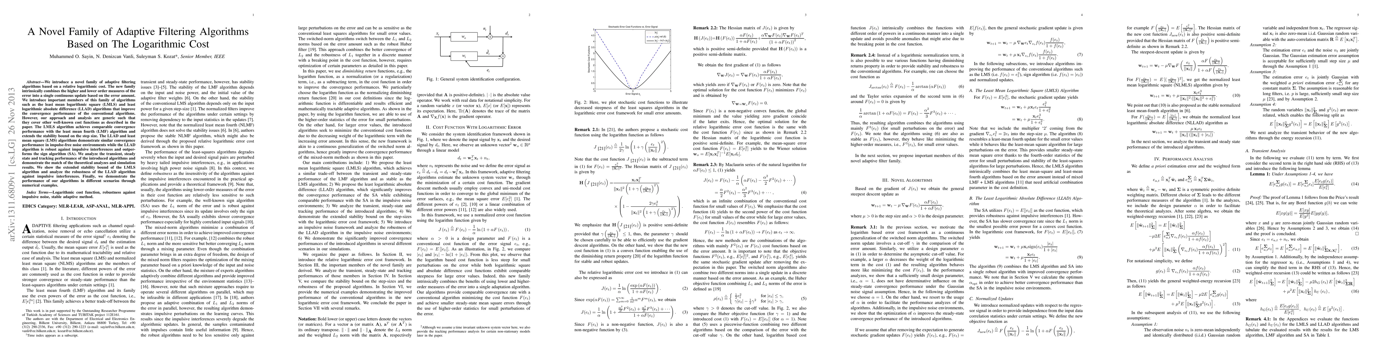 This paper introduces a new family of adaptive filtering algorithms based on a logarithmic cost, including the least mean logarithmic square (LMLS) and least logarithmic absolute difference (LLAD) algorithms. These algorithms improve convergence performance and robustness, especially against impulsive interferences, compared to conventional methods.