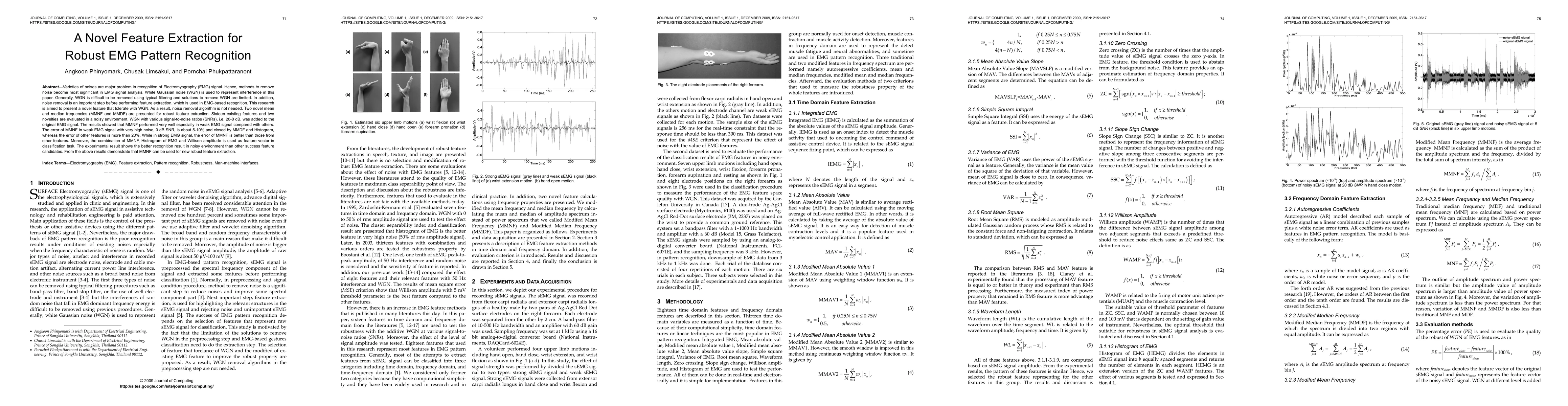 The research presents a novel feature, Modified Mean Frequency (MMNF), for robust Electromyography (EMG) pattern recognition that tolerates white Gaussian noise (WGN), eliminating the need for noise removal algorithms. It evaluates sixteen existing features and two novel features (MMNF and MMDF) in a noisy environment with varying signal-to-noise ratios (SNRs) from 20 to 0 dB.