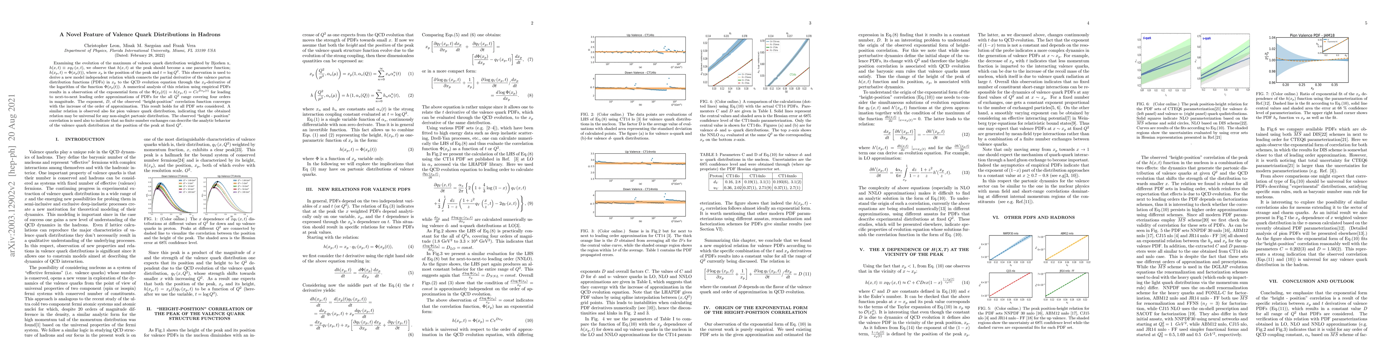 Researchers discovered a novel feature of valence quark distributions in hadrons, showing that the distribution at its peak becomes a one-parameter function with an exponential correlation between its value and position, holding true across different PDFs and orders of approximation.