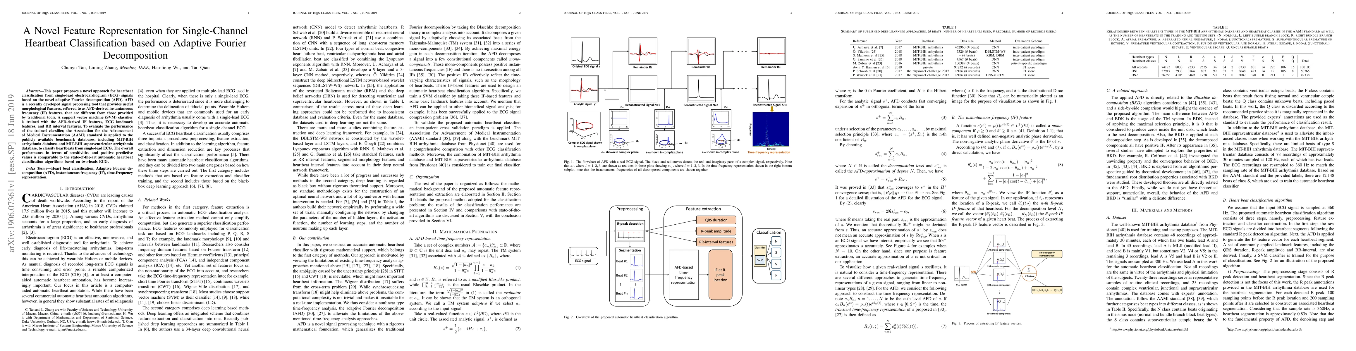 This paper introduces a new method for classifying single-lead ECG heartbeats using adaptive Fourier decomposition (AFD) to extract unique instantaneous frequency features, which are then used to train a support vector machine classifier. The method achieves performance comparable to state-of-the-art algorithms typically using two-lead ECGs.