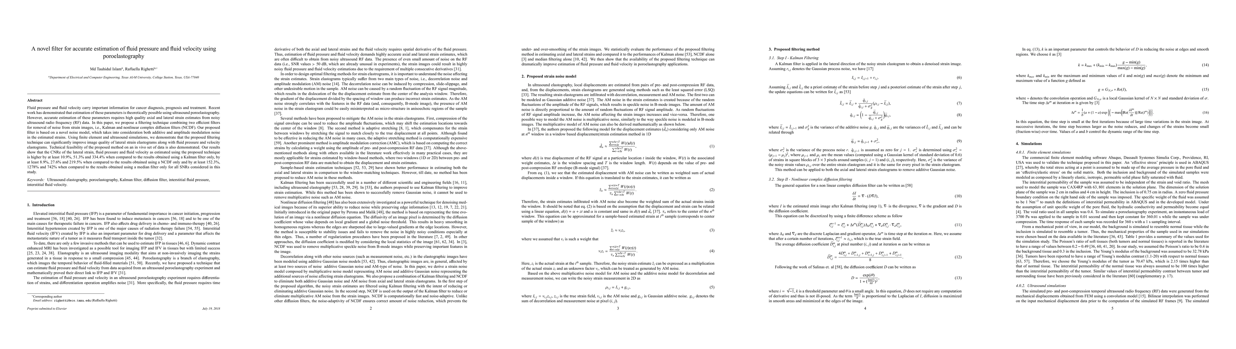 Fluid pressure and fluid velocity carry important information for cancer diagnosis, prognosis and treatment. Recent work has demonstrated that estimation of these parameters is theoretically possible using ultrasound poroelastography. However, accurate estimation of these parameters requires high quality axial and lateral strain estimates from noisy ultrasound radio frequency (RF) data. In this paper, we propose a filtering technique combining two efficient filters for removal of noise from strain images, i.e., Kalman and nonlinear complex diffusion filters (NCDF). Our proposed filter is based on a novel noise model, which takes into consideration both additive and amplitude modulation noise in the estimated strains. Using finite element and ultrasound simulations, we demonstrate that the proposed filtering technique can significantly improve image quality of lateral strain elastograms along with fluid pressure and velocity elastograms. Technical feasibility of the proposed method on an in vivo set of data is also demonstrated. Our results show that the CNRe of the lateral strain, fluid pressure and fluid velocity as estimated using the proposed technique is higher by at least 10.9%, 51.3% and 334.4% when compared to the results obtained using a Kalman filter only, by at least 8.9%, 27.6% and 219.5% when compared to the results obtained using a NCDF only and by at least 152.3%, 1278% and 742% when compared to the results obtained using a median filter only for all SNRs considered in this study.