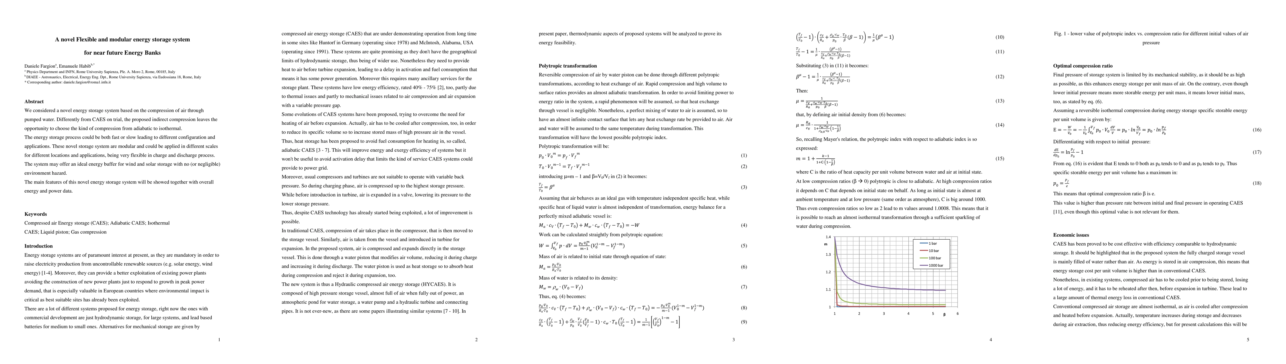 We considered a novel energy storage system based on the compression of air through pumped water. Differently from CAES on trial, the proposed indirect compression leaves the opportunity to choose the kind of compression from adiabatic to isothermal. The energy storage process could be both fast or slow leading to different configuration and applications. These novel storage system are modular and could be applied in different scales for different locations and applications, being very flexible in charge and discharge process. The system may offer an ideal energy buffer for wind and solar storage with no (or negligible) environment hazard. The main features of this novel energy storage system will be showed together with overall energy and power data.