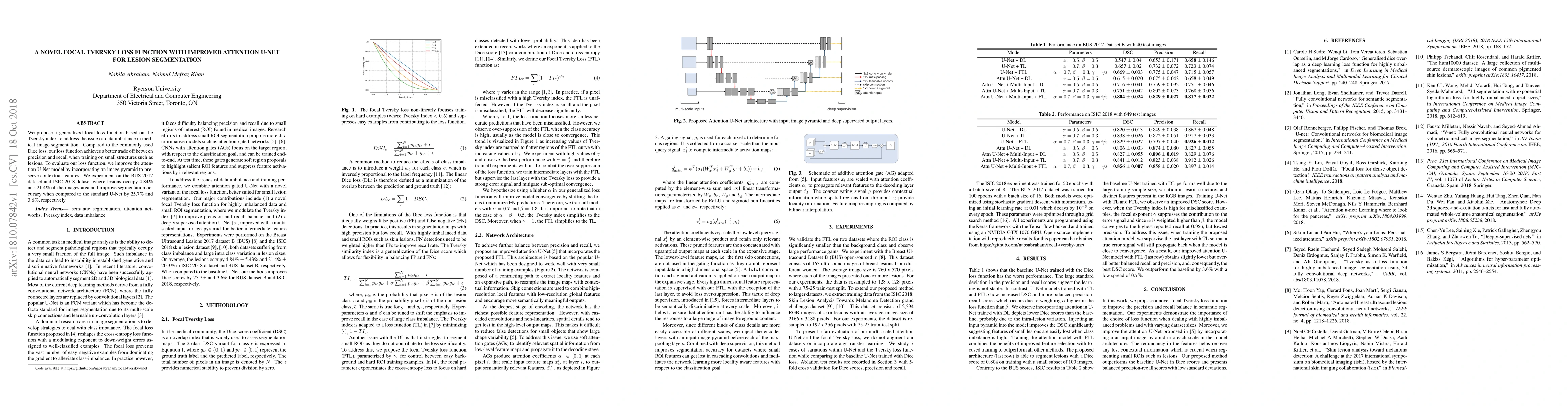 This paper introduces a novel focal Tversky loss function to tackle data imbalance in medical lesion segmentation, achieving better precision-recall trade-offs compared to Dice loss. The improved Attention U-Net model, enhanced with an image pyramid, demonstrates superior segmentation accuracy on the BUS 2017 and ISIC 2018 datasets.